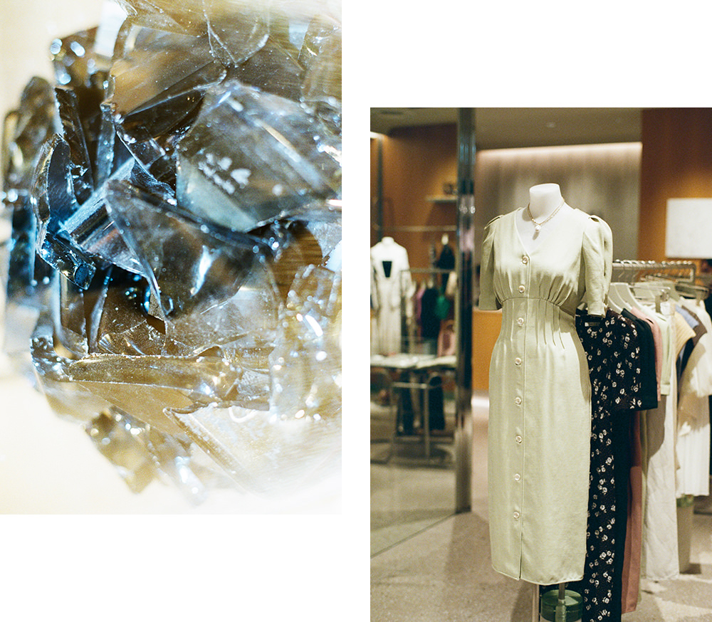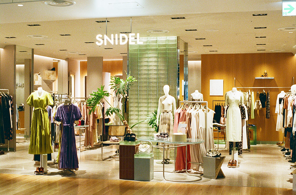 「アパレルが与える環境への影響やサステナブルへの取り組みは、私自身も学んでいる最中です」とゆうこすさん。SNIDELでは渋谷PARCO店含む、全国の一部店舗で「#SNIDEL_FOR_SUSTAINABILITY」プロジェクトを順次スタート。店内には、回収した使用済みの蛍光灯やブラウン管など自社工場で安全に適正処理して得られた原料を装飾として使用。床にはセメントを主原料にする人造大理石のテラゾータイルを起用、ミラーは鉛を含まない成分のものを使用している。アパレルラインではオーガニックの綿花やウールを用いた高品質な「ORGANICS SNIDEL」も一部展開している。