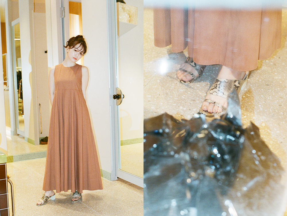コットンAラインロングワンピース ¥12,500+tax、ラウンドサボ ¥12,000+tax