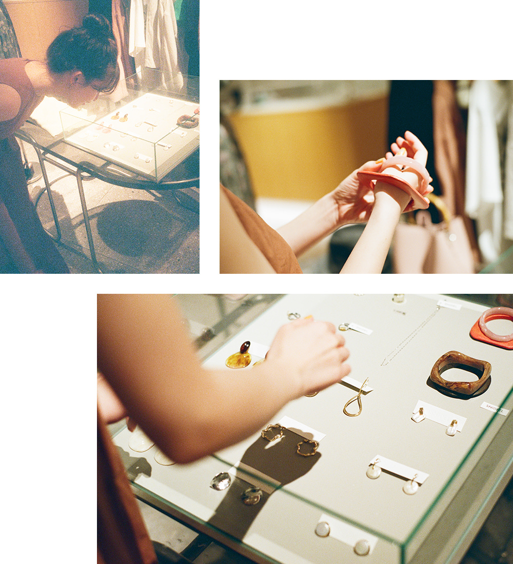 ショーケース内の小物やバッグに釘付けな、ゆうこすさん。「今は家にいる時間が多いので、気分をあげるためにも差し色となるアクセサリーに目がいきますね。外で運動する機会も増えたので、見た目もオシャレでたくさん入るメッシュバッグは今すぐにでも欲しい!」。小物使いで、いつものスタイルに変化をくわえてみては?