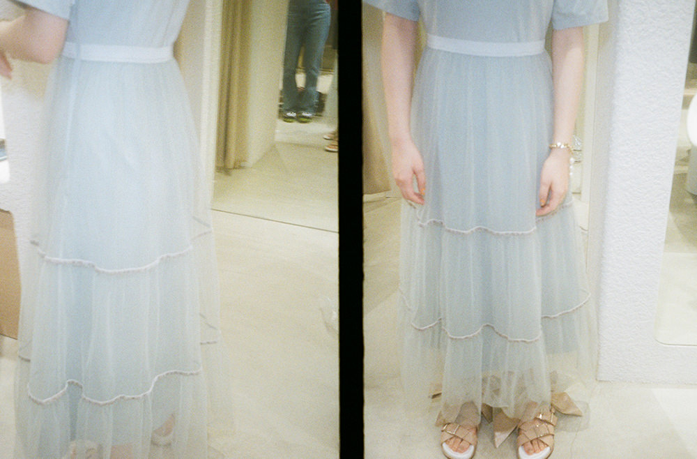 彼女がセレクトしたアイテムは、Tシャツとチュールスカートがドッキングされたワンピース。一見甘くなりがちなチュールアイテムも、カジュアルなTシャツと組み合わせることで抜け感のあるフェミニンスタイルが完成。「これ一枚でトレンドをしっかりおさえられるなんて、まさに優秀アイテム!」とゆうこすさん。足元は、あえてカジュアルな編み上げリボンのサンダルをチョイス。耳元にはクリア素材のイヤリングで女性らしさを添えて。より女性らしく装うなら、ウエストマークで切り替えたプリーツワンピースもおすすめ。