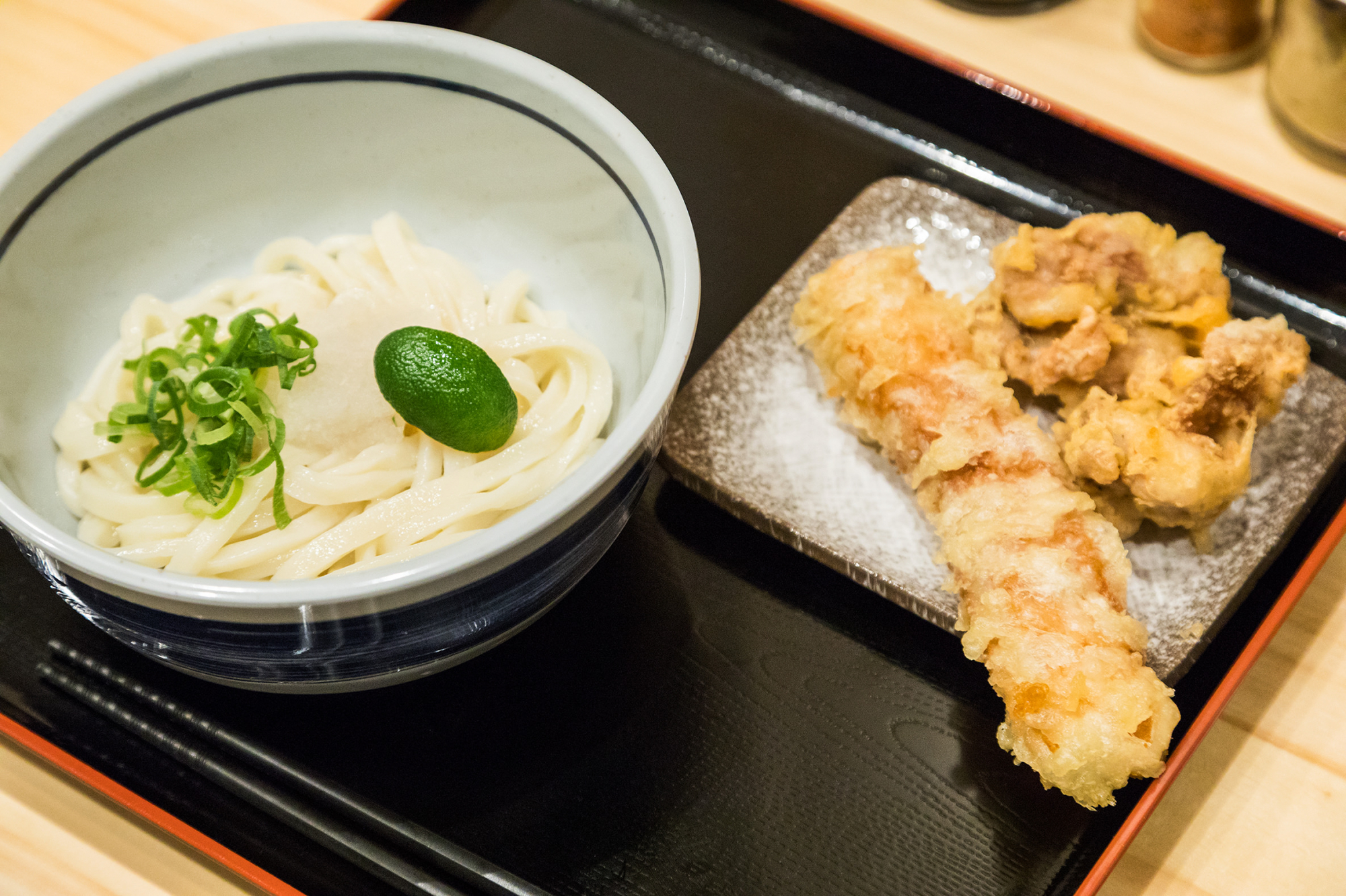 おにやんまの看板メニュー「ひやかけ とり天ちくわ天ぶっかけ」