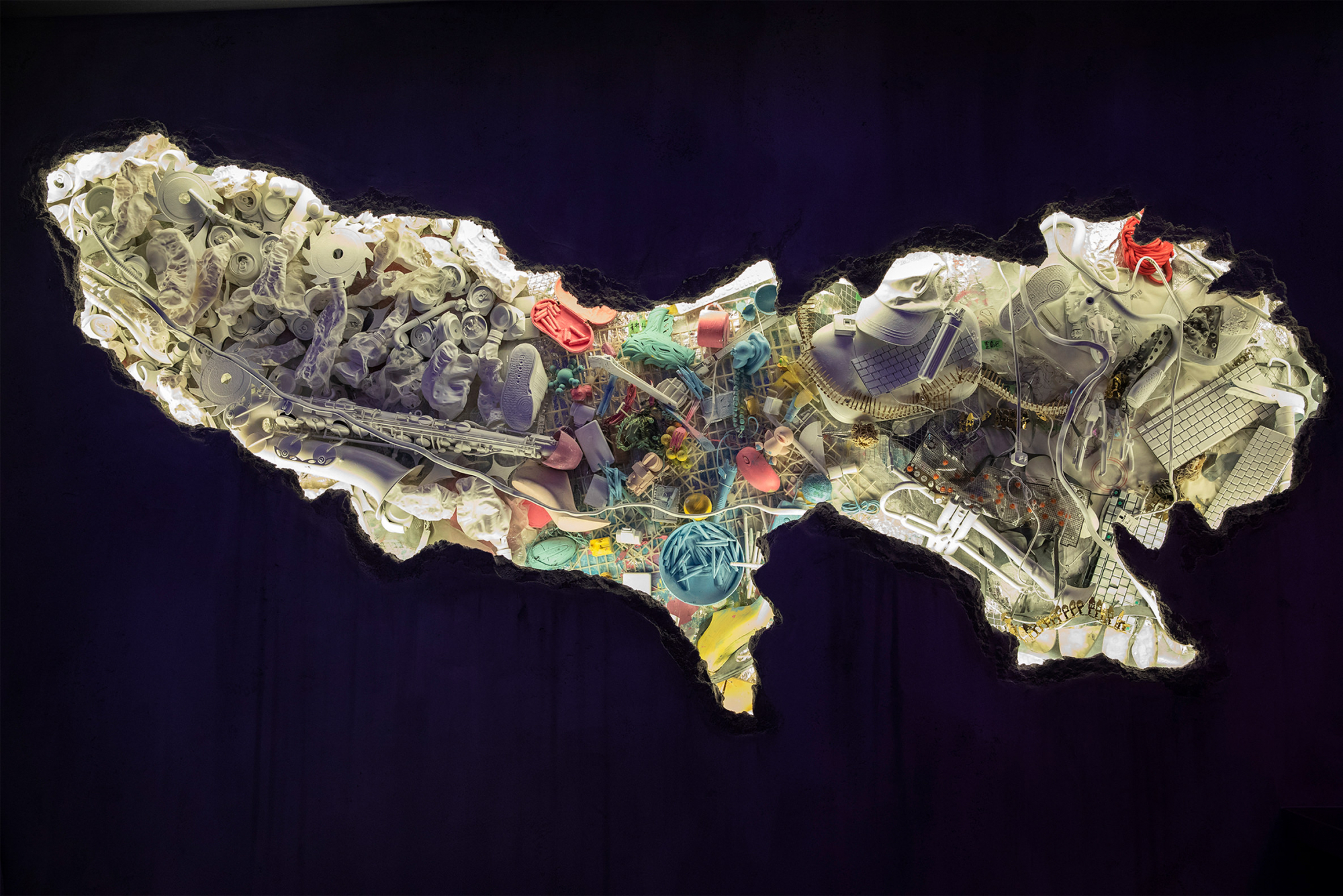 壁面に埋め込まれた廃棄物や宝物。よく見ると東京都の形をしている。