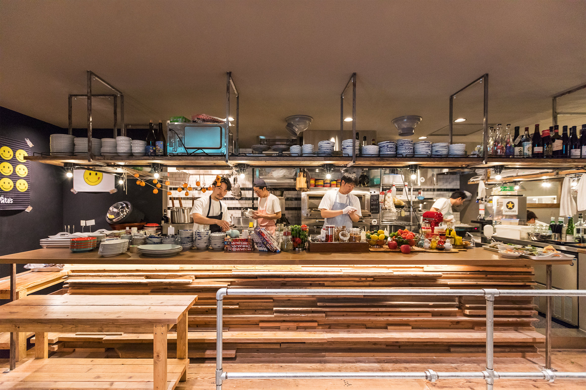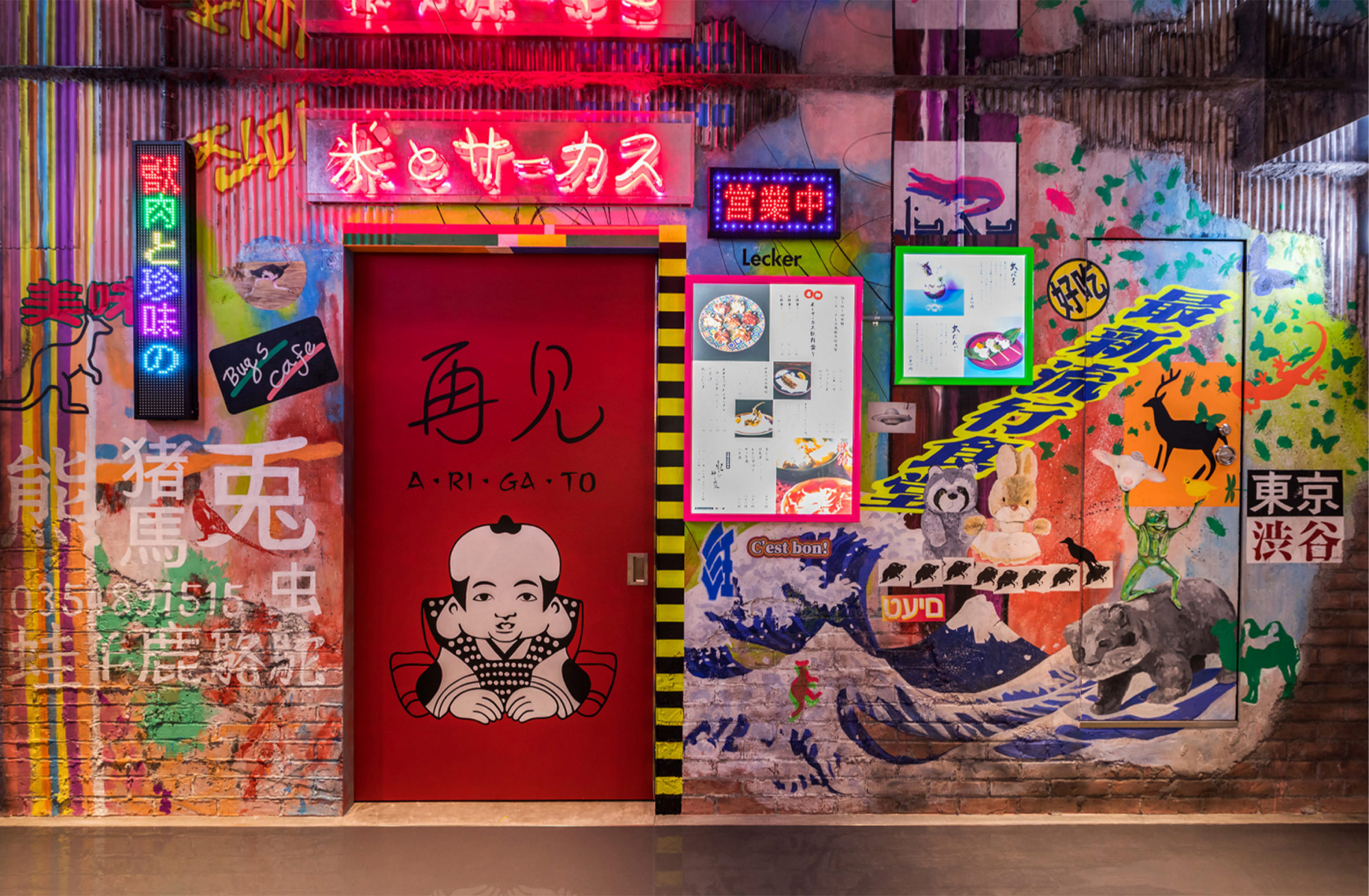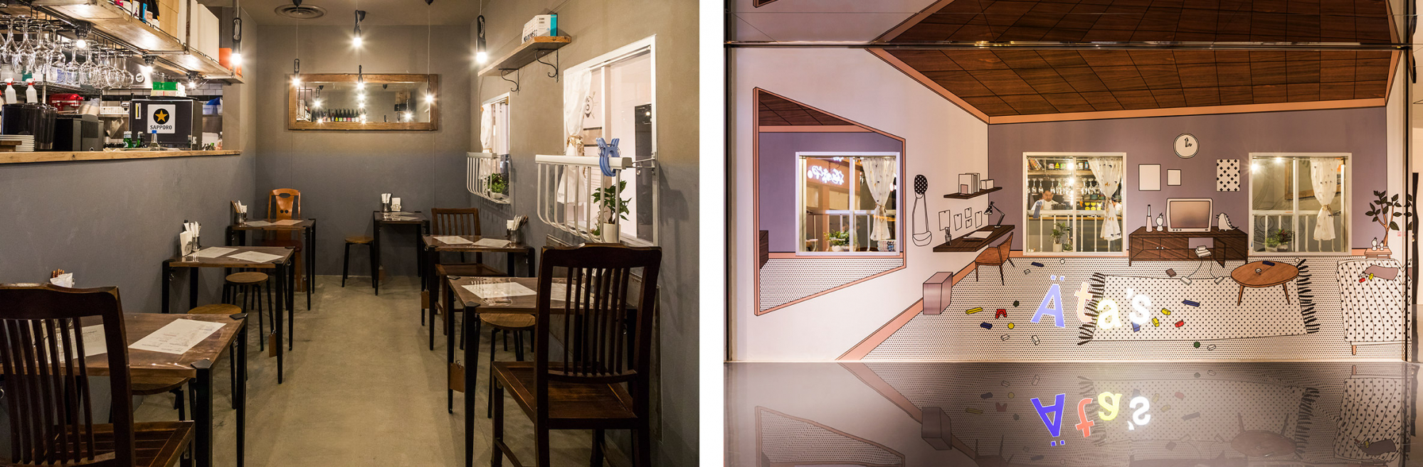 「上の階にはテクノロジーやエンターテインメントなど新しい世界がありますが、それに対する地下の我々の店はどこか混沌とした雰囲気にしたいという思いがありました。そんな裏表を表現するために外側の壁面は子供部屋を表現しています。子供部屋の窓から、店内をのぞくと混沌とした飲食店が見える。裏表を逆転させたイメージなんです。