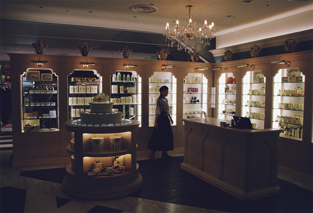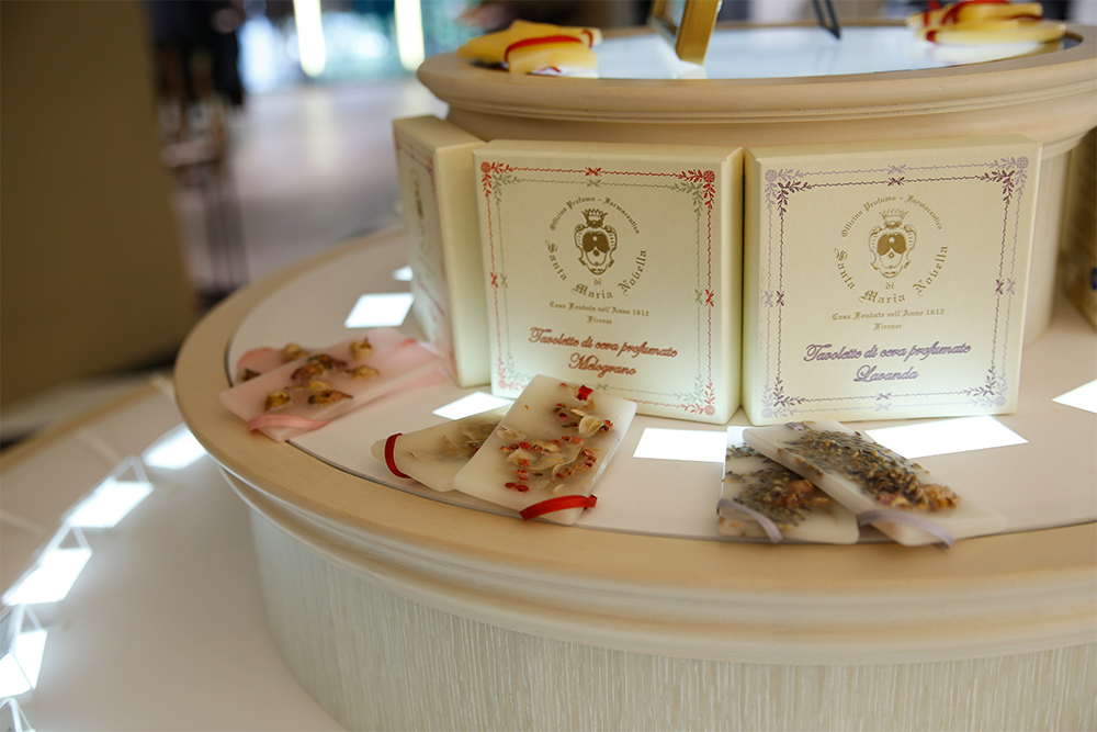 渋谷PARCO店の特徴は、開かれた店構え。明るい店内はシャンデリアが瞬き、芳しい香りが漂う。オーデコロンバーは渋谷PARCO店が初の設置で、約40種の香水を自由に試すことができる。香り選びがしやすいのは嬉しい限り。お店は小規模ながら、各アイテムが手に取りやすくお気に入りの一品を見つけやすく設計。食品やアルコールなど、Santa Maria Novellaの薬局らしい一面が楽しめるアイテムは、ショップスタッフに聞いて試してみよう。