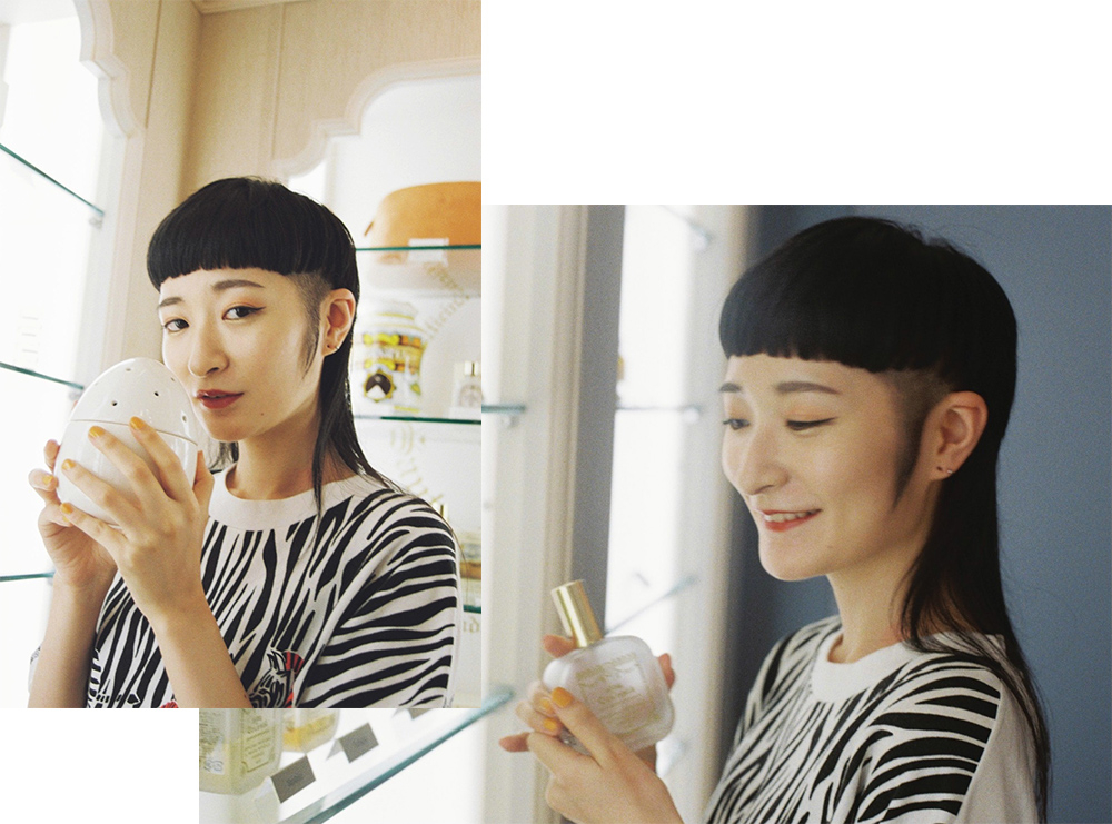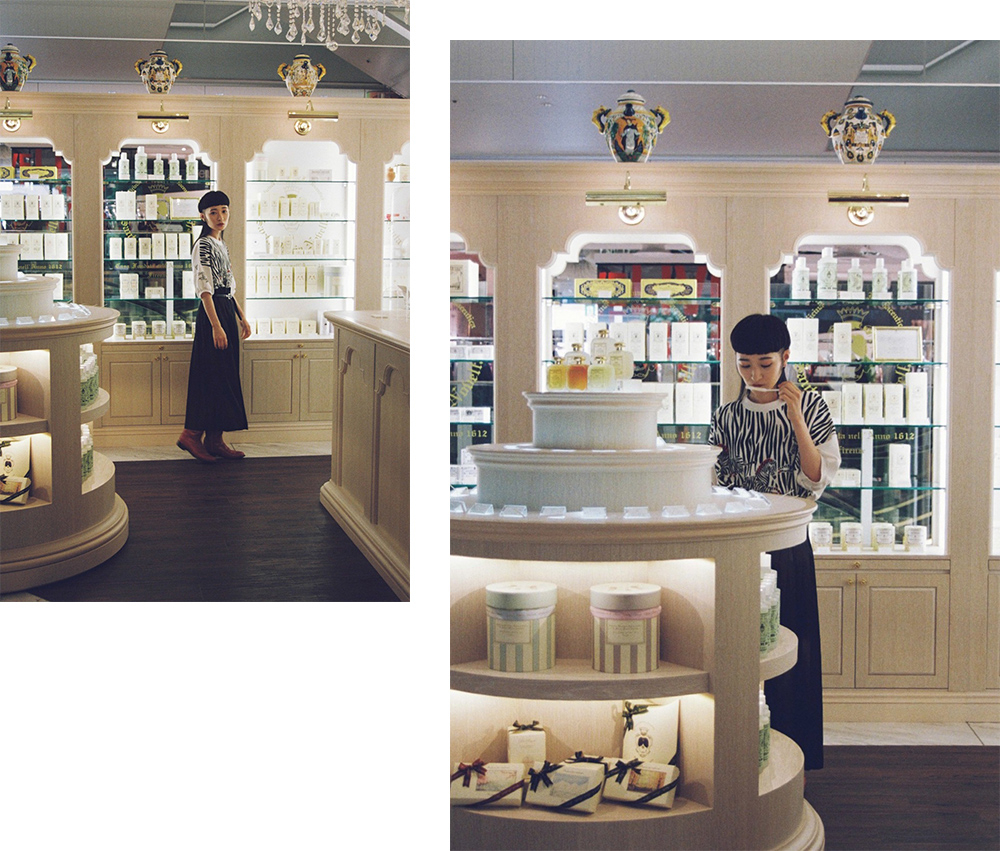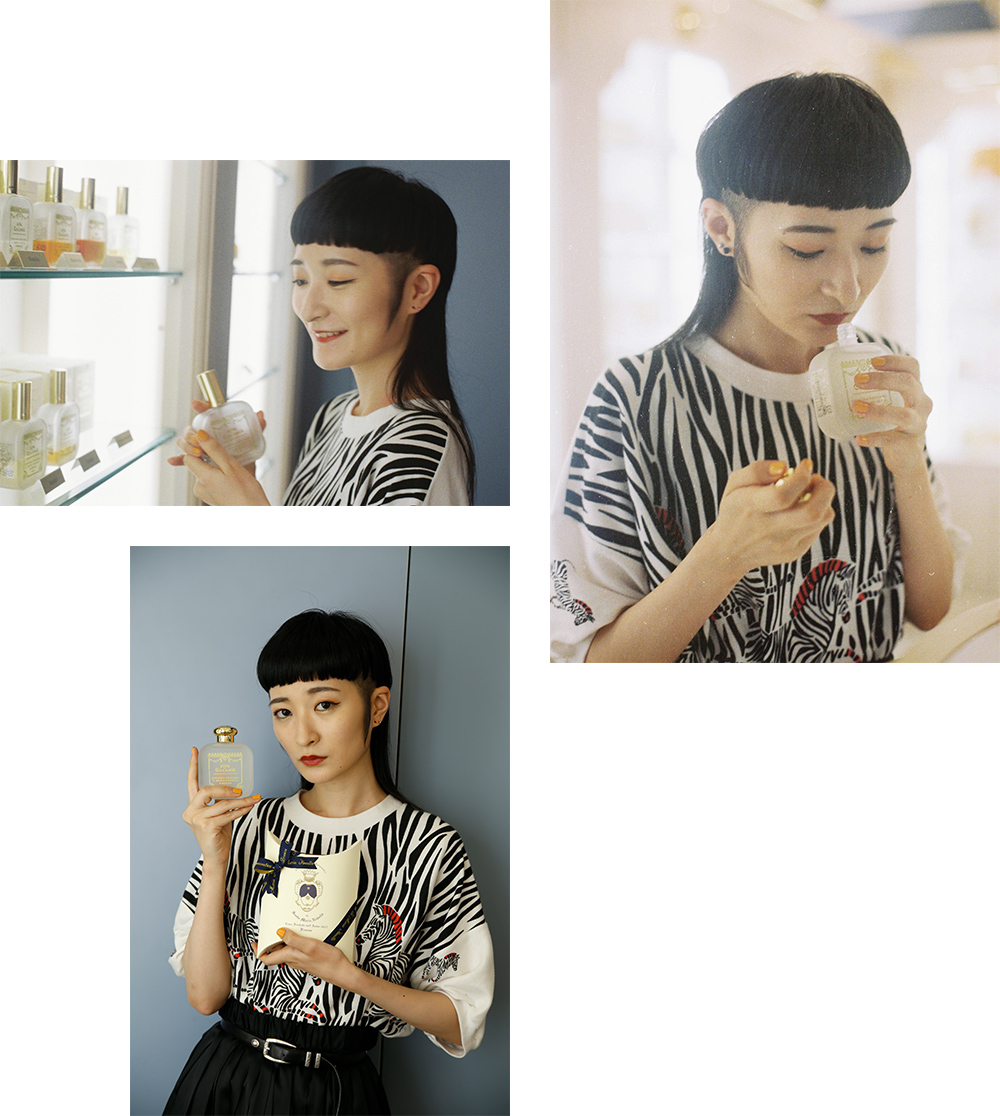 「情報通の友人に勧められて、ここに来るのを楽しみにしていました」というリンリンさん。さっそく自分にぴったりな香りとして『トバッコ・トスカーノ』をセレクト。「香ばしいウッディ系の落ち着いた香りが、気に入りました。イメージがシックなところも素敵だと思います。お部屋に置いても絵になりそう」。男性にもファンが多く幅広い年齢層にフィットするこの香りは、アーティスティックな感性を持つ彼女らしいチョイス。