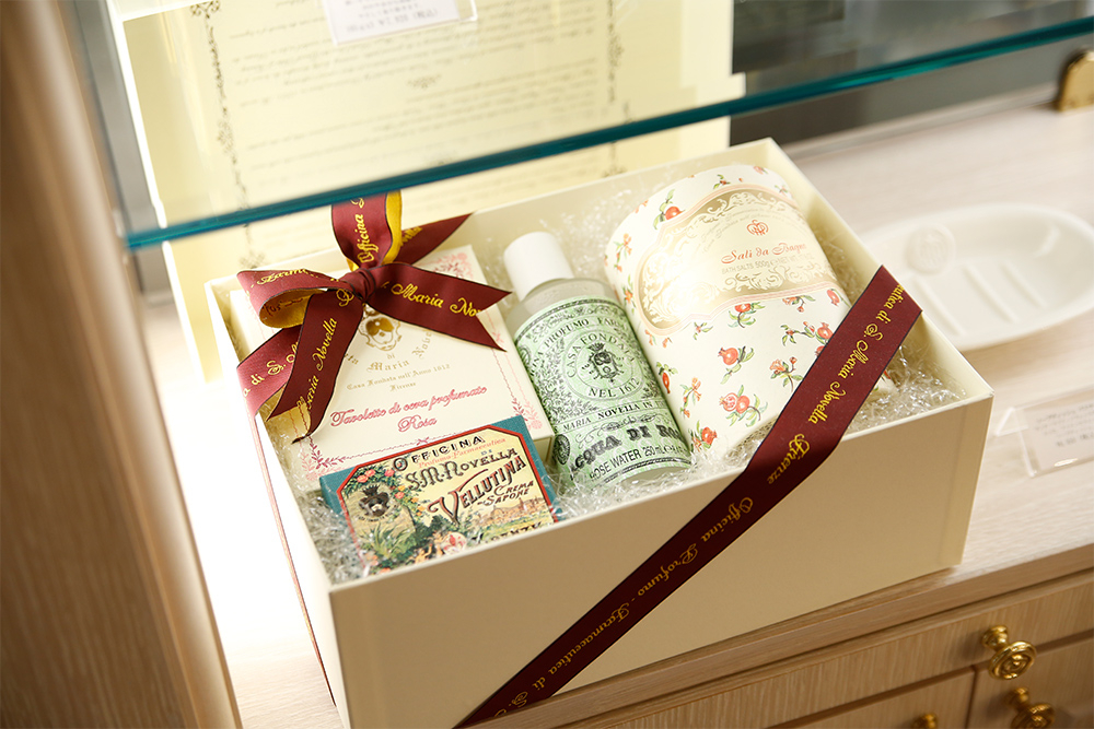 「チッチはリーダー的存在なので、植物の落ち着いた香りの『ポプリ』。ボーイッシュなモモコは『サンタ・マリア・ノヴェッラ』のスタンダードな香り。女性らしいアイナにはオリエンタルでな甘い『バニラ』を。末っ子で甘えん坊なアユニは、精神面にポジティブなれる『パチューリ』。大人っぽいハシヤスメには甘いフローラル系の『ジネストラ』を選びました」クラシックな絵柄のギフトボックスも充実し、贈り物選びにぴったり。