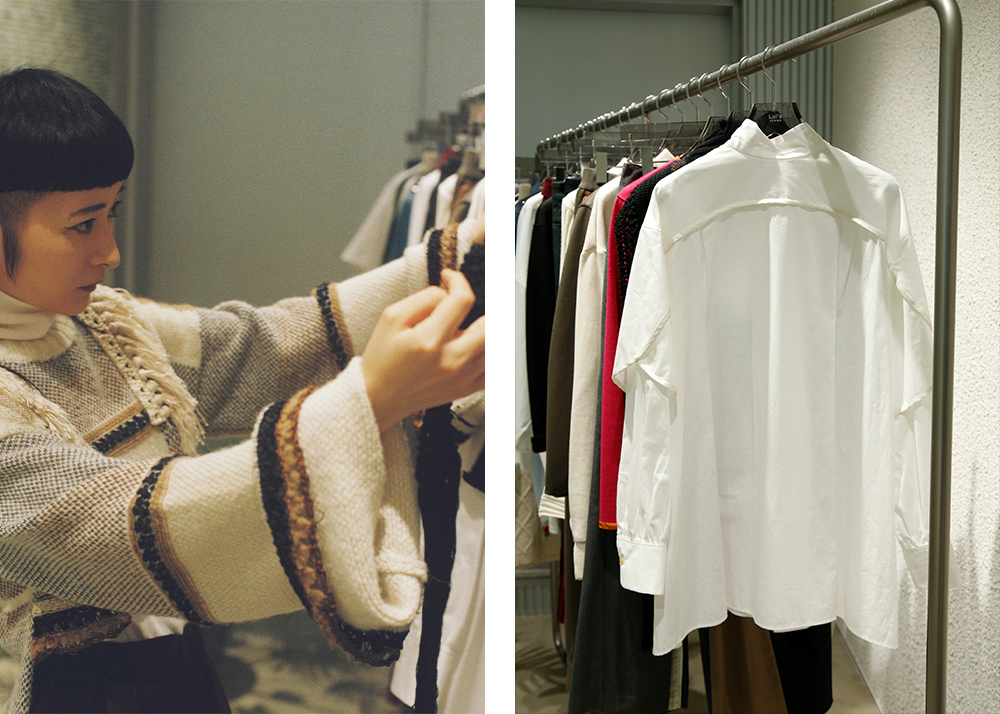 リンリンさんが店内を眺めながら見つけたアイテムは、LENZのブラウス。彼女が普段からinstagramで見せる私服のようなモードで、エッジの効いたデザイン。選んだ理由は「スタンドカラーのデザインとボリュームのある袖のバランスが好きなんです」。クラシックで、どこか反骨心が垣間見られるアイテムに惹かれるという。ポップアップが店頭で開催中のADSRのサングラスも試着していた。
