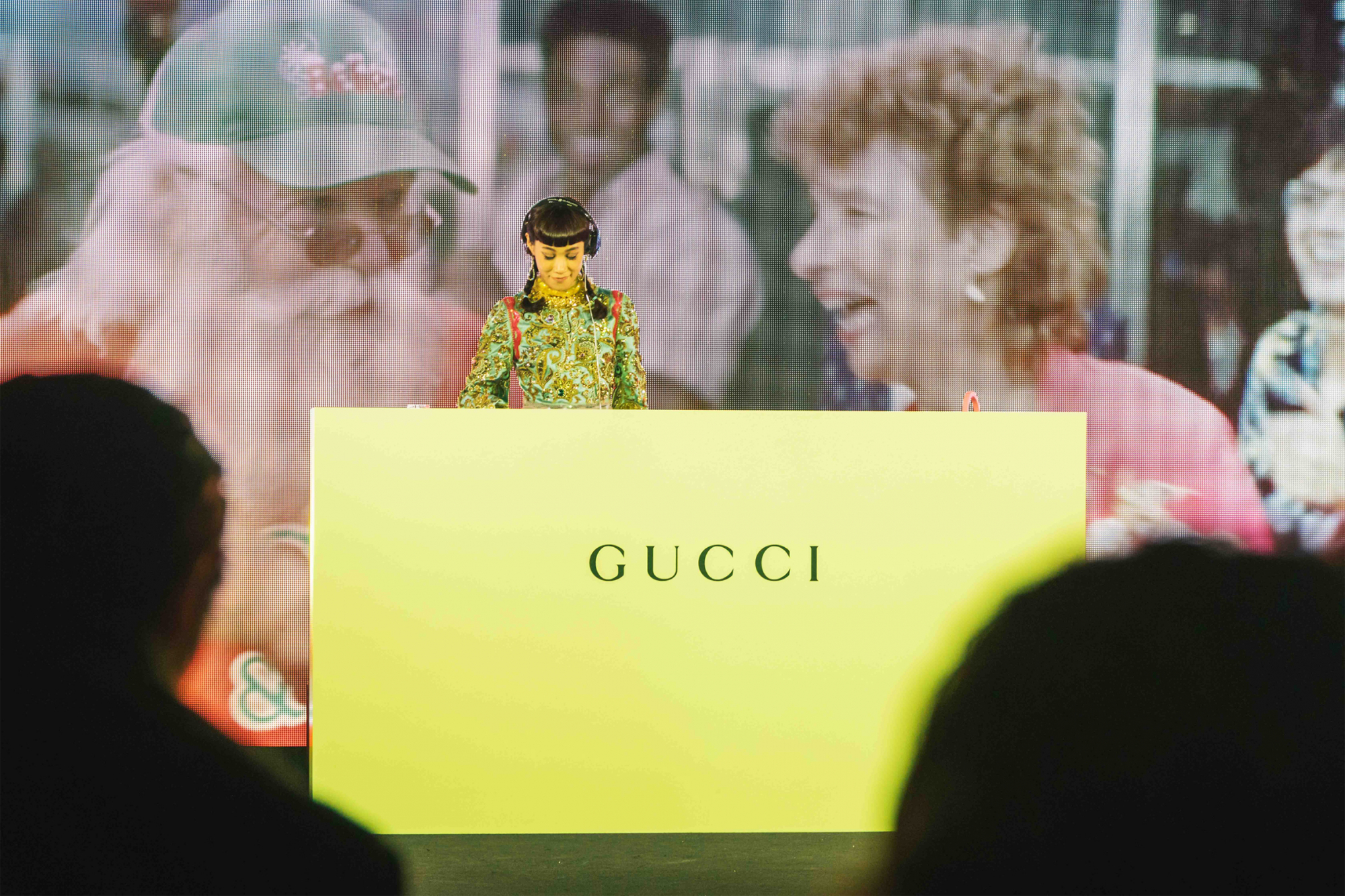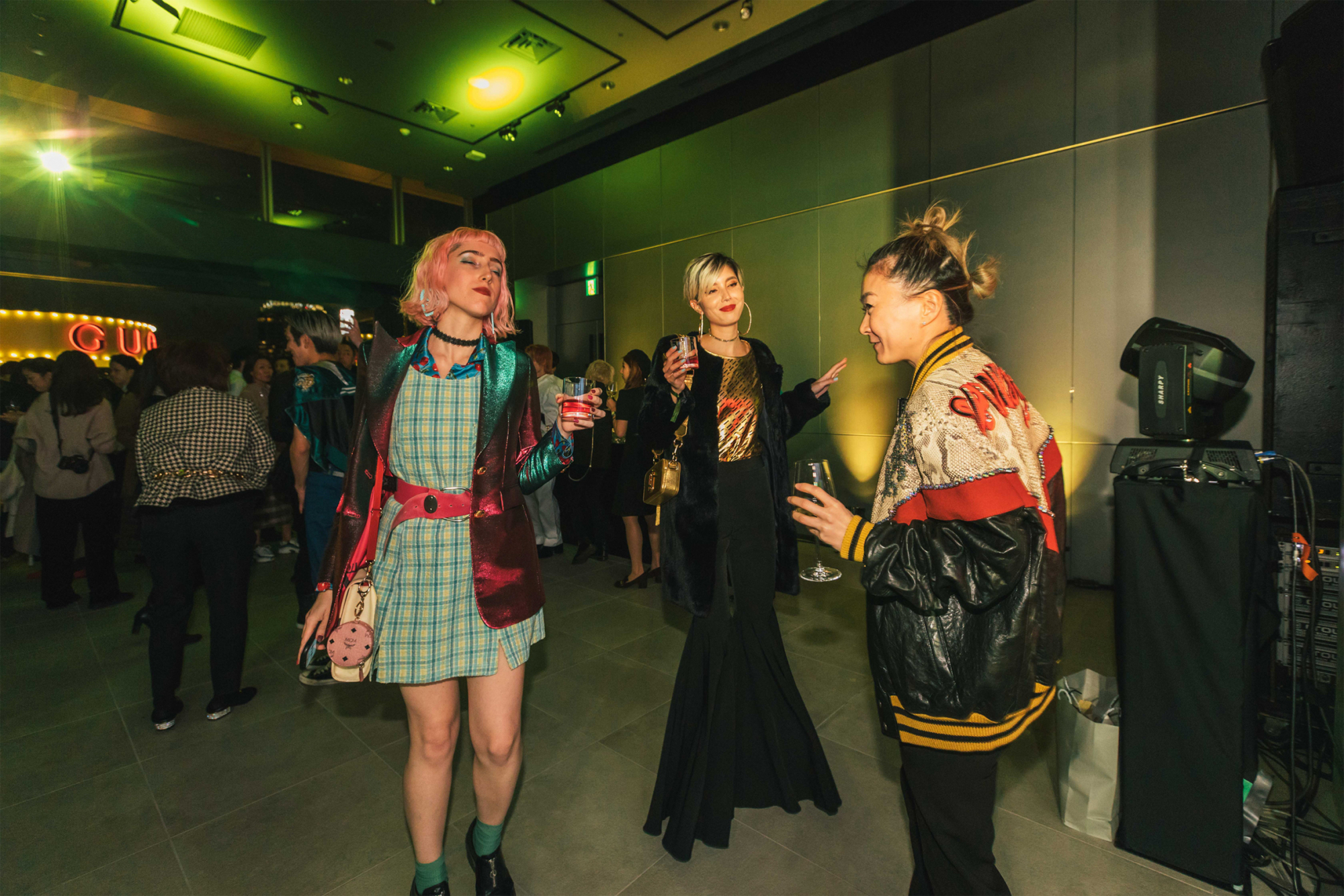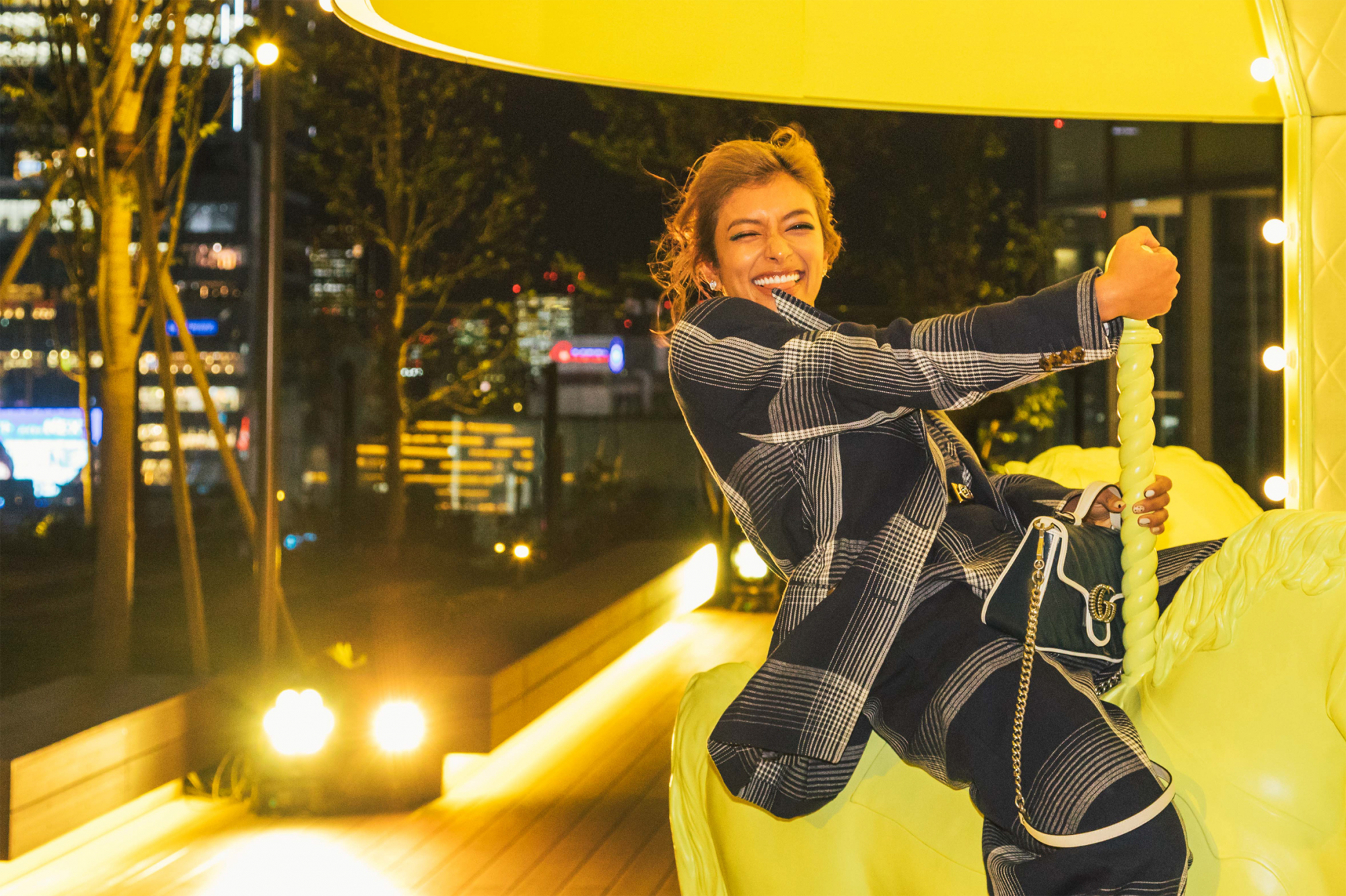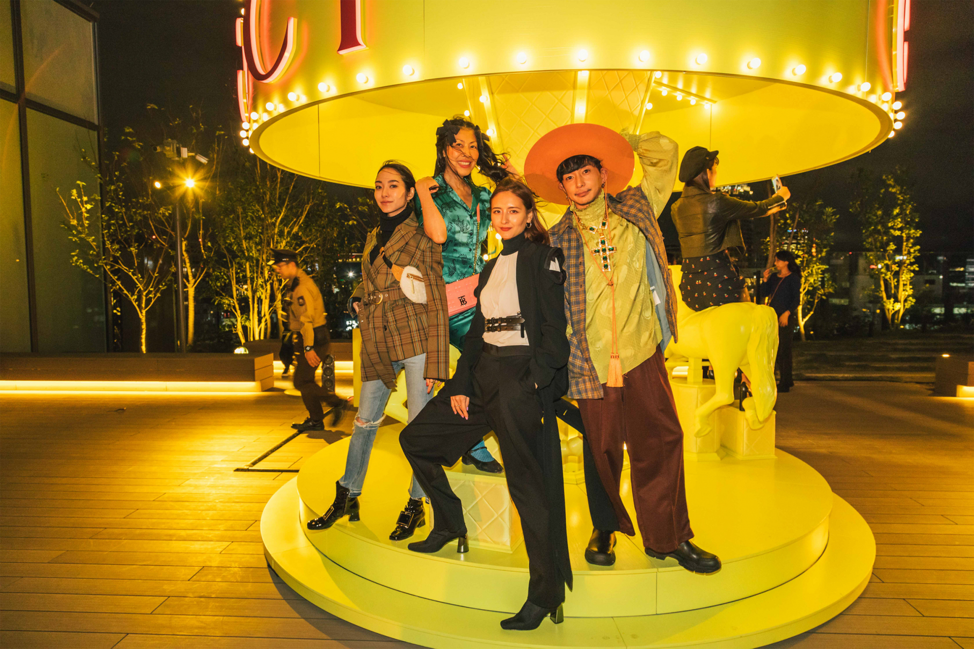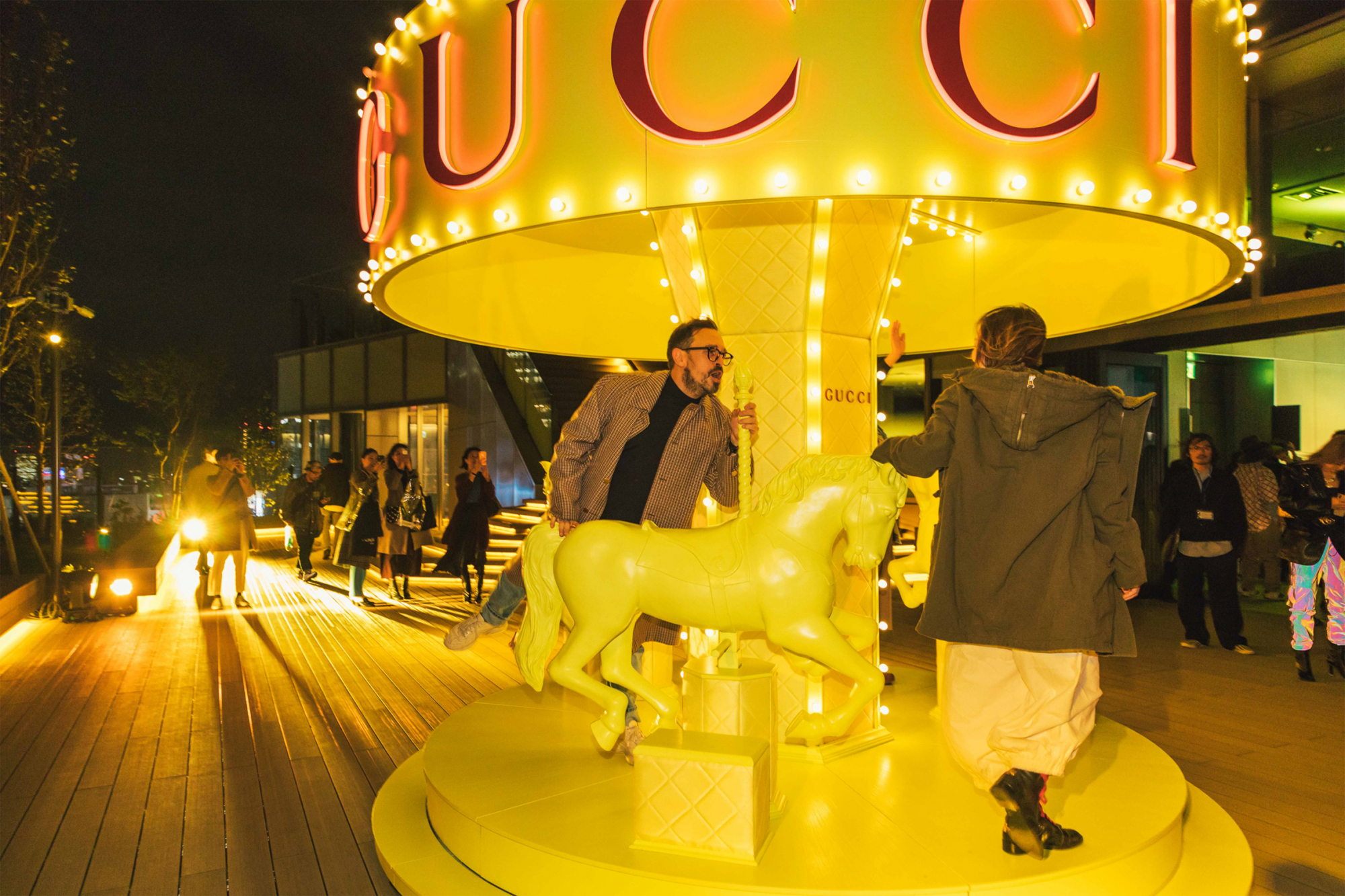 10FのROOFTOPにて開催されたGUCCIのローンチパーティ。注目は、この日のために用意された特注のメリーゴーランド。渋谷PARCO店の内装インテリアでも使われているキーカラーのイエローが、夜の暗がりの中で一際目立つ。シャンパンやフィンガーフードを片手に、DJやダンスを楽しむゲストたちの姿が印象的だった。