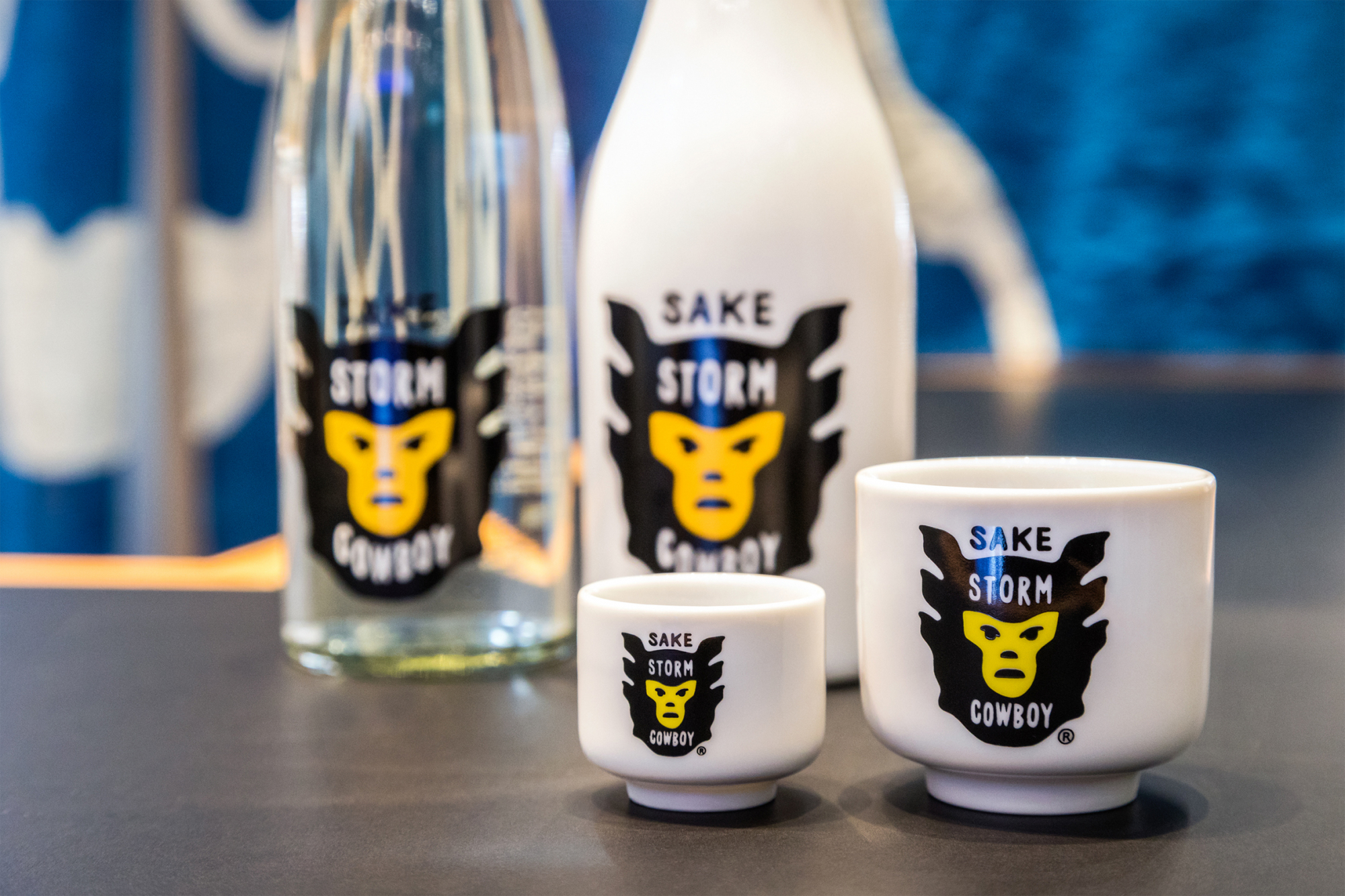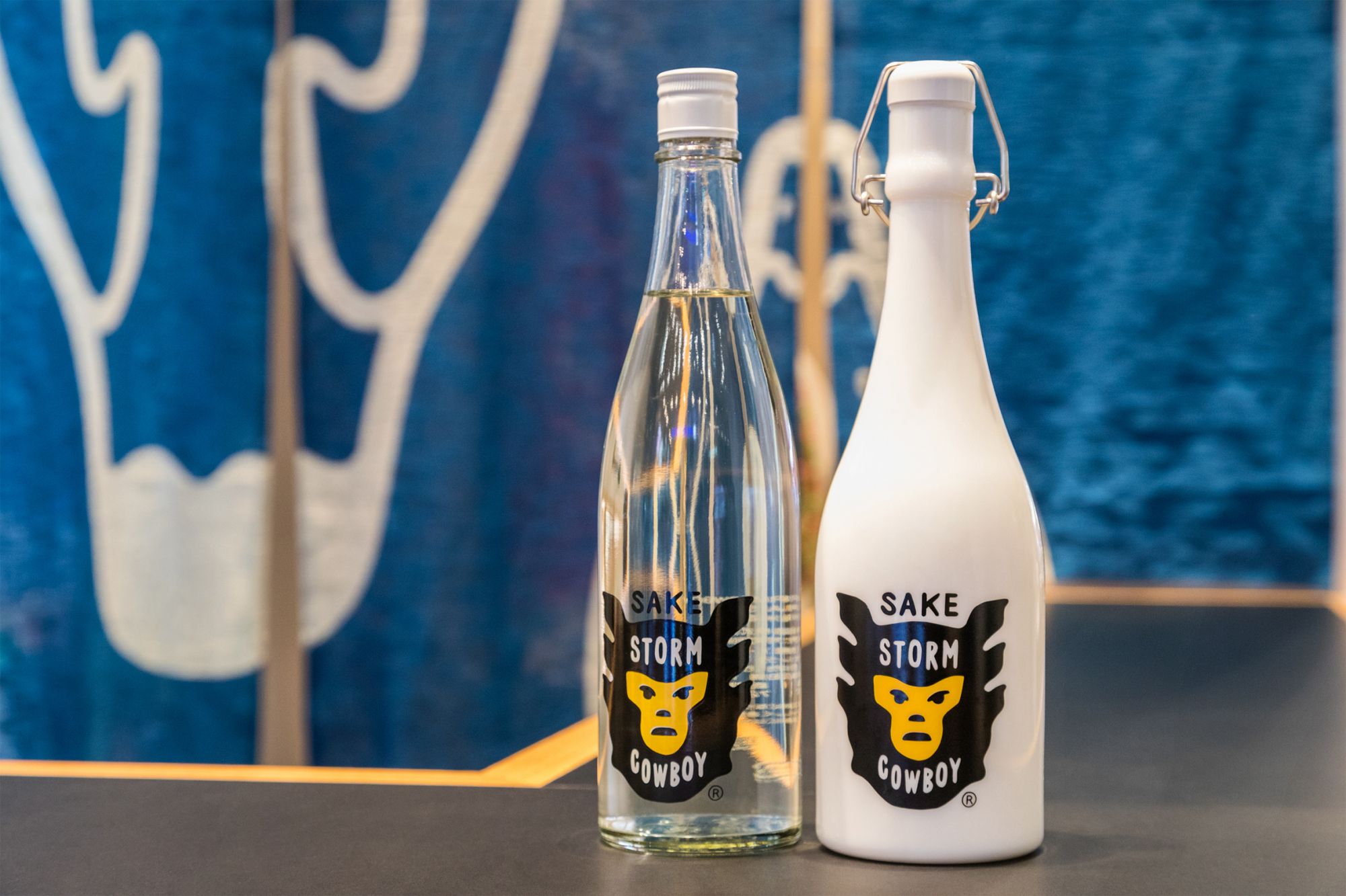 「SAKE STORM COWBOY®︎純米酒(写真奥左)」、「純米大吟醸(写真奥右)」。スタンディングバーではSMALL¥350+tax、LARGE¥900+taxで提供。720mlのボトルでの購入も可能。