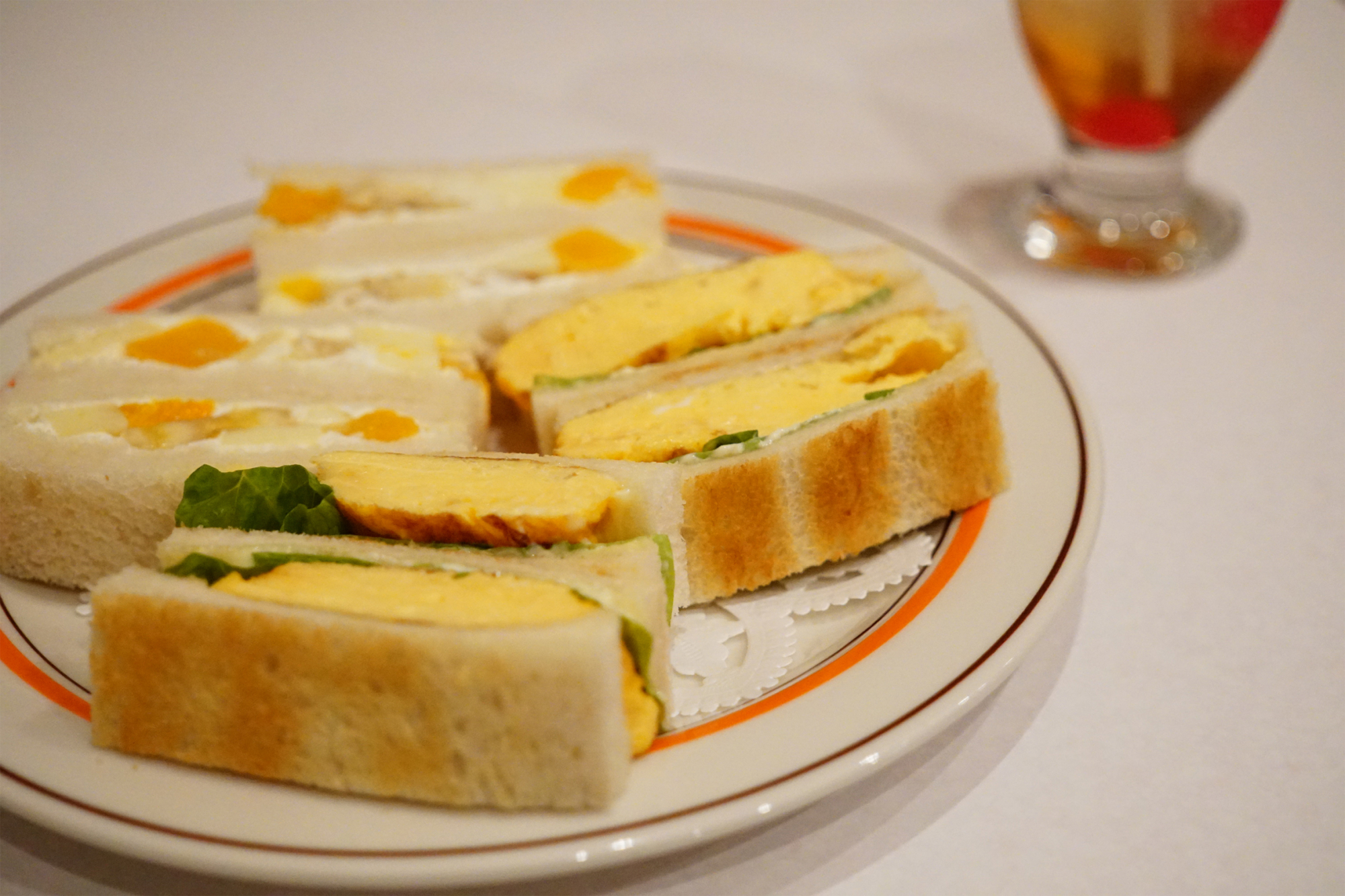 サンドゥイッチは、同じ値段のものから2種類組み合わせることも可能。「ハム・サンドゥイッチ」「チーズ・サンドゥイッチ」「フルーツ・サンドゥイッチ」などクラシックなメニューが揃う。