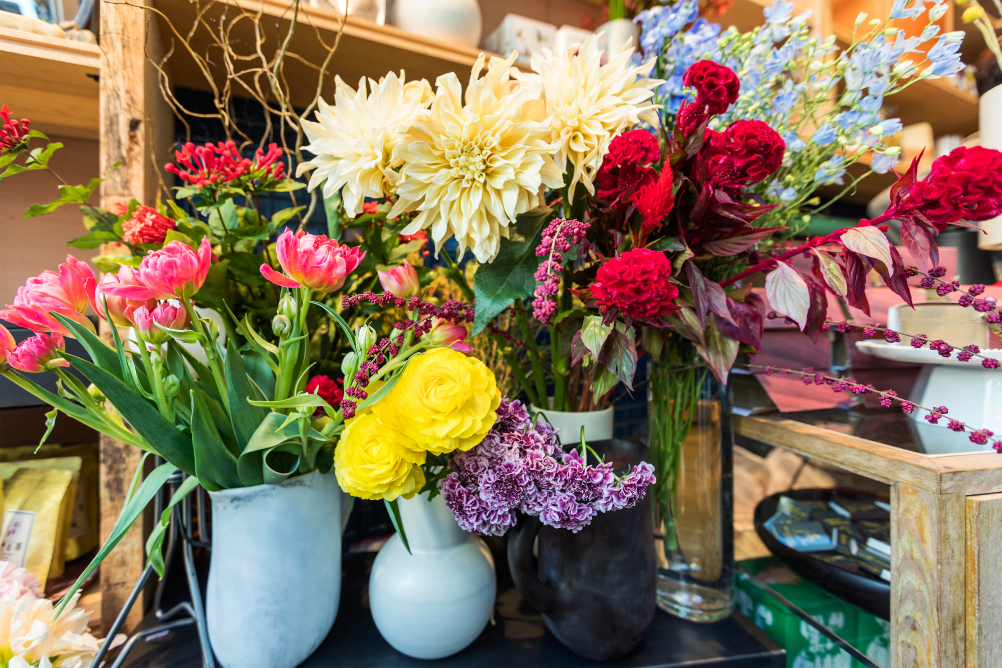 公園通り沿いの角のエリアにあるのが、『THE LITTLE BAR OF FLOWERS』だ。渋谷PARCO内とはいえ、“街角”という表現のほうがしっくりくるこぢんまりとした店内には、いろとりどりの花々が天井までぎっしりと並んでいる。