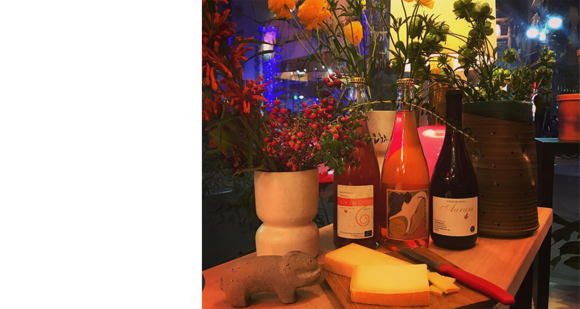 この街角の小さなお花屋さんは、夜、不定期でワインスタンドに変化する。『restaurant eatrip』のスタッフもっさんによるワインは、ナチュールワインを中心としたセレクト。