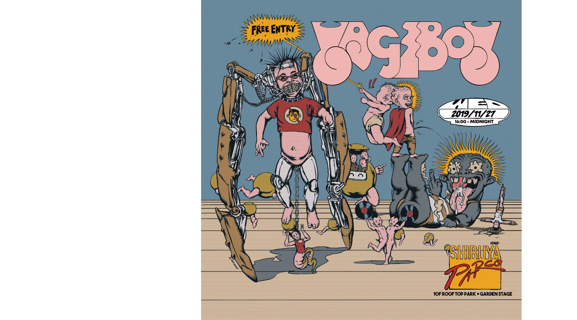 「GALLERY X」のあるB1F“CHAOS KITCHEN”には、深夜から明け方まで暖簾をかかげる飲食店もある。それに伴い、「GALLERY X」も展示イベントによっては営業時間を変更されるとのこと。それを知ったレイジさんは、「GALLERY XでYAGIを24時間ぶっ通しでやりたいな。東京中のDJが入れ替わり立ち替わりでスピンしてもらって、それを全部MIXテープに収めたらおもしろいと思う」と興味津々。彼の言う“ YAGIBOY ”とは、不定期で主宰するイベント「YAGI EXHIBITION」のことで、レイジさんと交流のあるクリエイターを招き、服やアートなどを販売・展示するDJイベント。2017年の初回は24時間ノンストップで開催して話題となり、その後は全国各地でも開催。11月27日には渋谷PARCOのグランドOPENに際して、渋谷の古着屋「BOY」とクロスオーバーし、「YAGIBOY」と銘打った合同エキシビションを行なった。ライブパフォーマンスからDJプレイ、さらにはフリーマーケットまでを組み込んで大成功。「YAGIBOYのフライヤーをデザインしてもらったのは、Instagramで見つけたインドネシアのイラストレーターDwiky Ka。独自のユーモアを絶妙なポップ感で作品に落とし込んでいて、誰にも真似できないセンスを持っていると思う。面識がないけどデザインをオファーしてみたら、喜んで引き受けてくれたんですよ。いつか来日してもらって、GALLERY Xで彼の個展もできればいいなって思っています」。