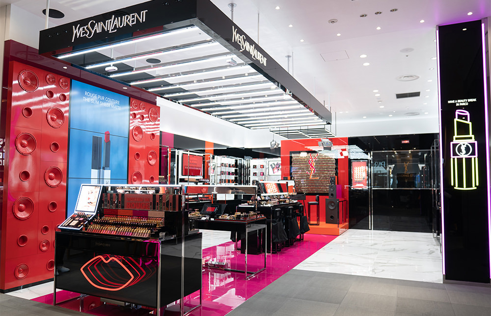 渋谷PARCOのYves Saint Laurent Beauté(イヴ・サンローラン・ボーテ)は、“音楽”を主題にしたコンセプチュアルな空間。赤いスピーカーが目を惹く店内の奥に、世界で唯一の「レコーディングスタジオ」を併設。商品1点購入につき1回無料で自分の写真を撮影&プリントアウトできる。そのほか、好みの音楽に合わせたリップカラーの提案やタブレットの画面上で色を選んで試せる「リップファインダー」など、楽しみながらメイクを満喫できるコンテンツが充実。リップやフレグランスの刻印サービスや店舗限定のギフトラッピングも見逃せない。