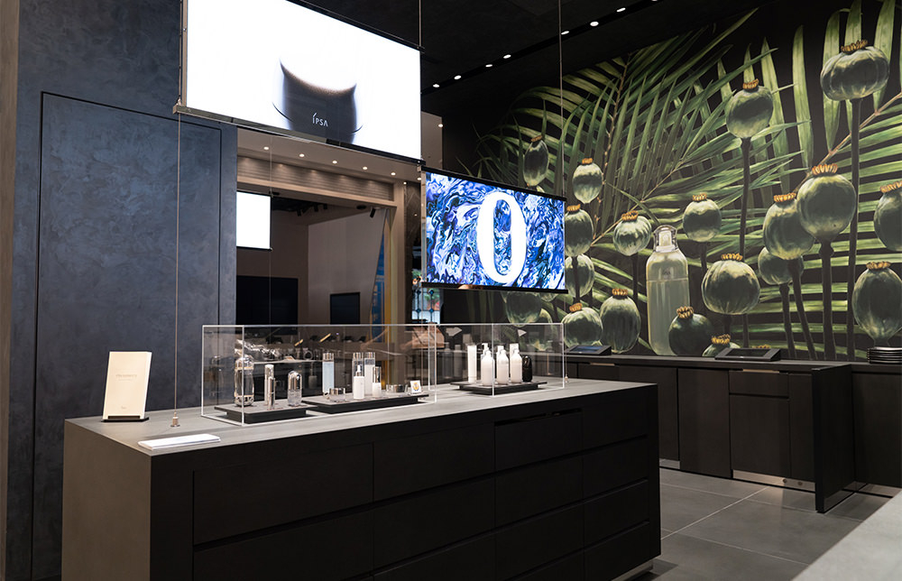 人間が本来もっている肌の力に着目し、カウンセリングを通してひとりひとりの美しさを引き出すコスメブランド、IPSA(イプサ)。渋谷PARCO店は、ブラックを基調としたギャラリーのような空間に大きな手描きのシーズナルビジュアルを展開。既存の化粧品フロアと異なり、周囲にはメゾンブランドやカルチャーショップが並び、男性も入りやすい雰囲気だ。他店よりゆったりしたカウンセリングスペースも特筆。独自の肌分析機器「イプサライザー」を6台設置し、じっくりと自分に合うコスメを探すことができる。
