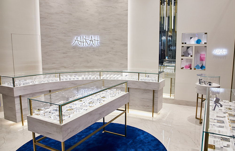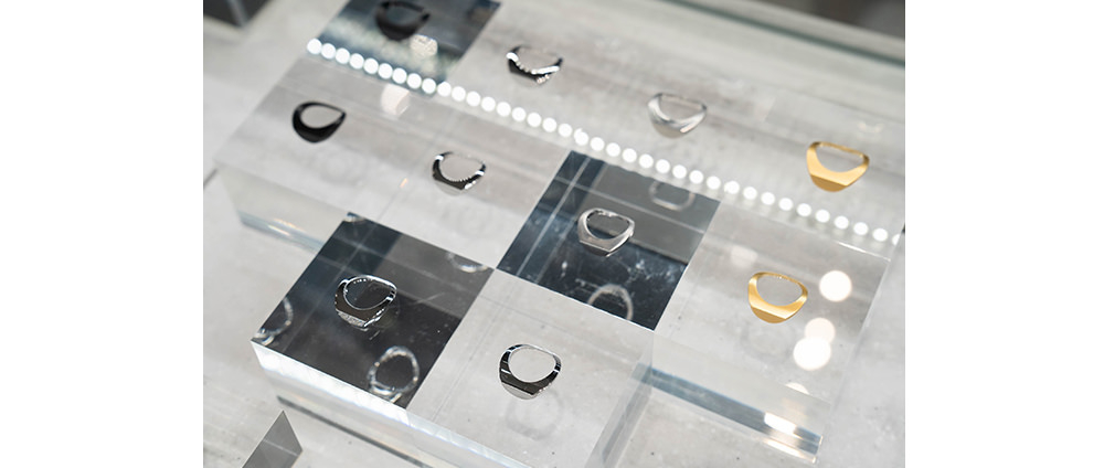 繊細かつしなやかなデザインで幅広い層から支持を得るジュエリーブランド、AHKAH(アーカー)。渋谷PARCO店では、NY在住のデザイナーとコラボしたジェンダーレスなコレクション「AHKAH×KOTA OKUDA」を常時取り扱い。ホワイトとゴールドを基調に差し色を効かせた、クリーンでスタイリッシュな内装も特徴。ファサードがガラス張りで開放感があり、男性も気軽に入りやすい雰囲気だ。ファッションジュエリーからラグジュアリーなコレクションまで、品揃えも豊富。