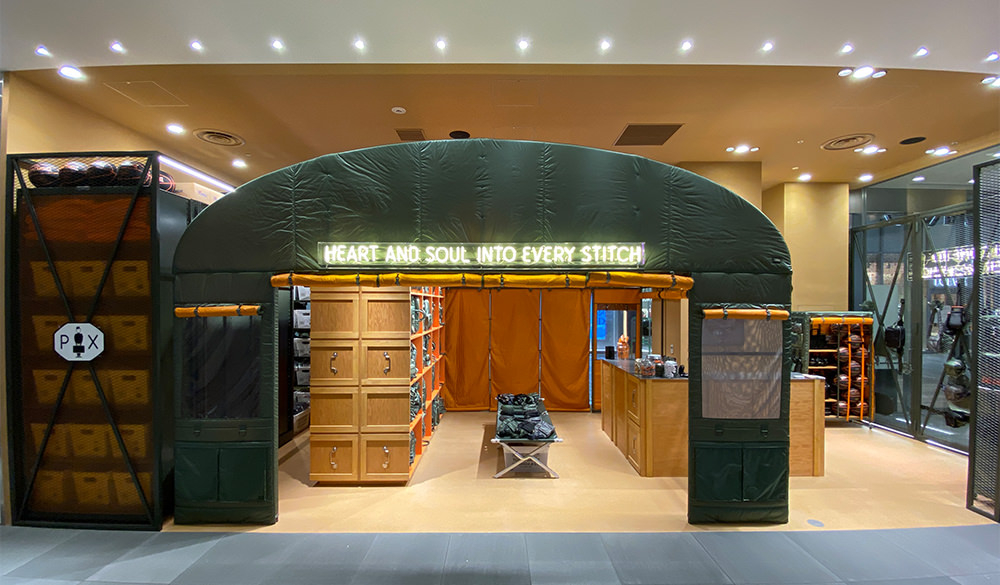 「吉田カバン」が初の自社ブランドとして1962年に発表したPORTER。以降、次々に生まれたヒットアイテムのなかでも、PORTERの代名詞といわれる名作が「TANKER」シリーズだ。PORTER EXCHANGE(ポーターエクスチェンジ)は、「TANKER」をメインに扱うショップ。ベースキャンプ内の売店(POST EXCHANGE)をイメージした店内に、「TANKER」のフルラインナップが揃う。なかでも注目すべきは、店舗限定の「PX TANKER」シリーズ 。既存の「TANKER」にない本体生地×パーツの組み合わせや内側についたミルスペックタグが特徴だ。