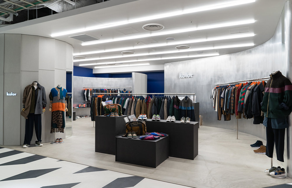 シーズンテーマを設けず、デザイナーの阿部潤一氏がその時々にベストなバランスだと感じるアイテムを展開し続けているkolor(カラー)。kolorらしい様々な素材感が目を惹く内装は、直営店のなかでもひときわ街の個性を意識した店づくりが特徴。湾曲した壁を効果的に配置して、複雑に絡み合うストリートと、それによって生まれる表と裏、空間と隙間といった渋谷らしさを感じさせる要素を表現している。kolorの世界観を反映させつつ、ほかの直営店とは異なる表情をもったショップだ。直営店限定や渋谷PARCO限定アイテムも展開される。