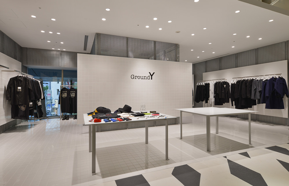 Yohji Yamamotoのコンセプトにシンクロする要素を多面的に取り入れながら、ジェンダーレス&エイジレスなスタイルを提案するGround Y(グラウンドワイ)。渋谷PARCO店では<Ground Y>に加え、<BLACK Scandal Yohji Yamamoto>も扱う。内装のイメージは“建物の裏方に使われる素材で作った、美術館のように壮大な空間”。バックヤードに使用される素材をあえて「表側」の店舗にいかし、空間の中にギャップを創りだした。山本耀司氏の服作りの根幹をなす反骨精神に通じる、既成概念にとらわれない店づくりだ。タイルとグレーチングを使った無機質な空間に服が映える。