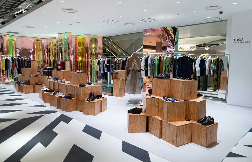 1997年に古田泰子氏が立ち上げて以降、発表の場を東京、パリ、ロンドンへと移しながらクリエイティビティに磨きをかけてきたTOGA(トーガ)。渋谷PARCO店は、原宿本店の打ちっぱなしで無機質なイメージから一変して、美しい色彩とカ有機的な素材がいきる空間。オーロラを表現した曲面のミラー板と積み上げられたウッドボックス、グリーンのタイルベンチが印象的だ。コレクションラインからメンズ、シューズなどフルラインが揃うほか、人気のレザーグッズやアクセサリーも充実。渋谷PARCO限定商品も定期的に登場する。
