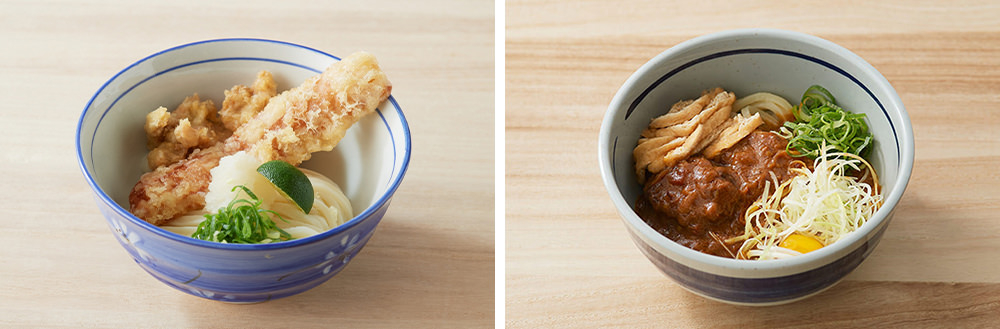冷とり天ちくわ天ぶっかけうどん¥530、<渋谷PARCO限定>牛バラカレーうどん¥1,000