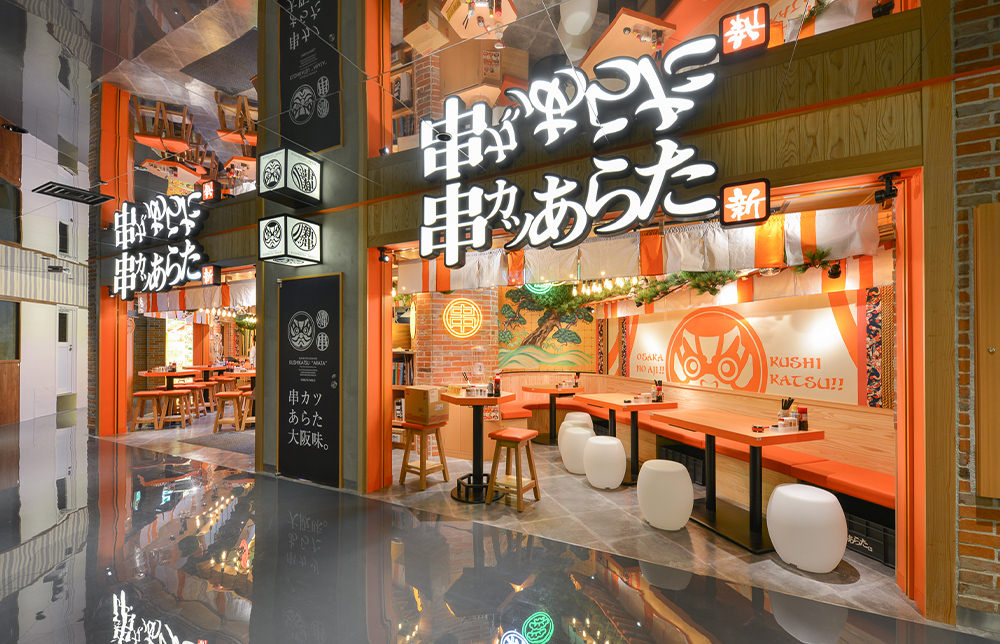 大阪スタイルの串カツ専門店。毎日手仕込みされた自慢の串カツは、オリジナルのパン粉を使用しており、外はサクサクなかはモッチリとした食感が特徴。揚げ物に合う「日本一のたまご飯」も人気メニューのひとつ。また、渋谷PARCO限定のダイナミックな「串カツツリー」、10種類以上のスパイスで作ったランチタイム限定の「大阪スパイスカレー」も味わえる。ジャポニズムをイメージした店内は、歌舞伎や近未来の要素を融合しており、インバウンドのゲストにも好評なのだそう。