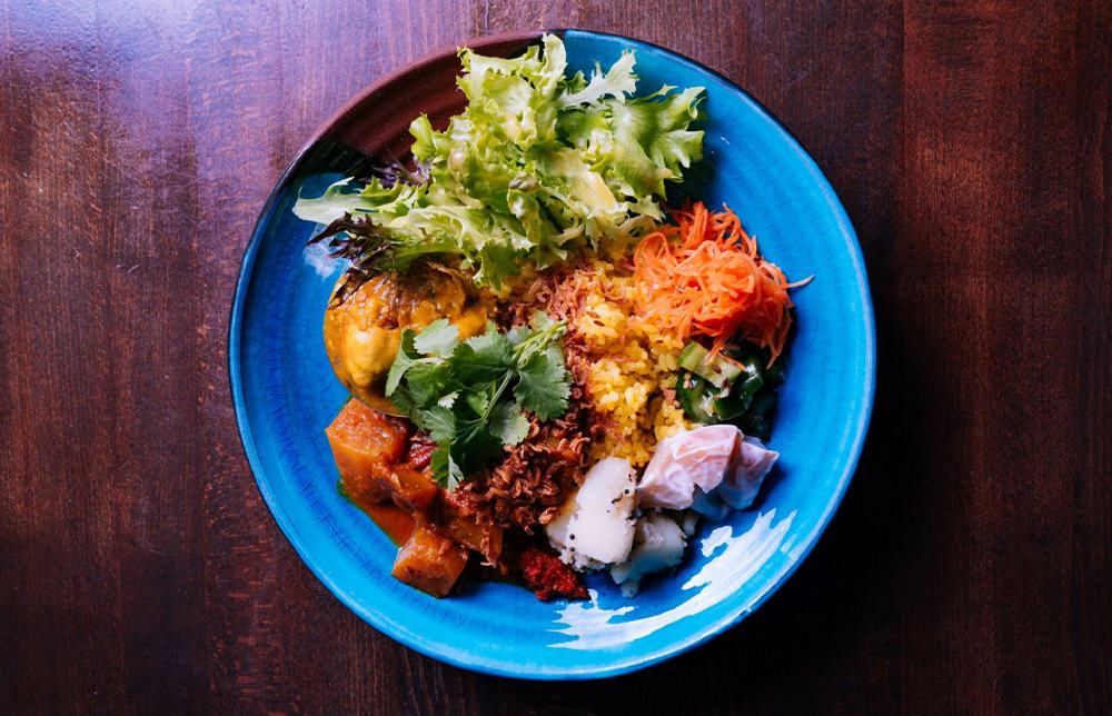 代官山のビストロ「Äta」の掛川シェフが手掛けるスパイスカレーのレストラン。魚介などの出汁にくわえ、スパイスはクミン、コリアンダー、マスタードシードなどメニューによって5種類以上を調合。看板メニューは、オーマル海老の出汁とブイヤベースを混ぜた「エビカレー」や「チキンジンジャーカレー」など。両方を楽しみたいなら「あいがけカレー」もおすすめ。色鮮やかな副菜がスパイスカレーをさらに引き立ててくれます。