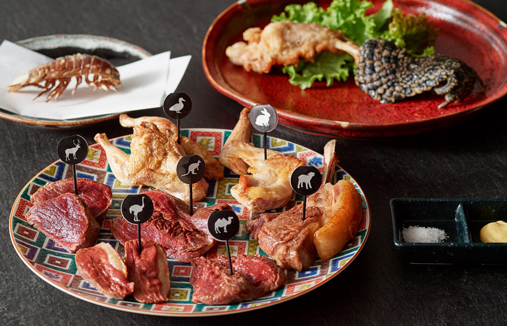ジビエ料理と昆虫料理を提供する、個性派酒場。昆虫を使った異色のメニューのなかでも、イナゴ、蜂の子、ミールワーム、タガメ、オケラ、ゲンゴロウを盛り合わせた「昆虫6種種比べ」はお店の看板メニュー。カウンターには、カマキリのタマゴやタツノオトシゴなど、全20種前後の滋養強壮酒を用意するほか、時期によっては珍しい獣肉に出会えることも。昆虫食は環境負荷の低さから、世界を救う食材としても注目されている。栄養価の高い一品をぜひお店で味わってみては。