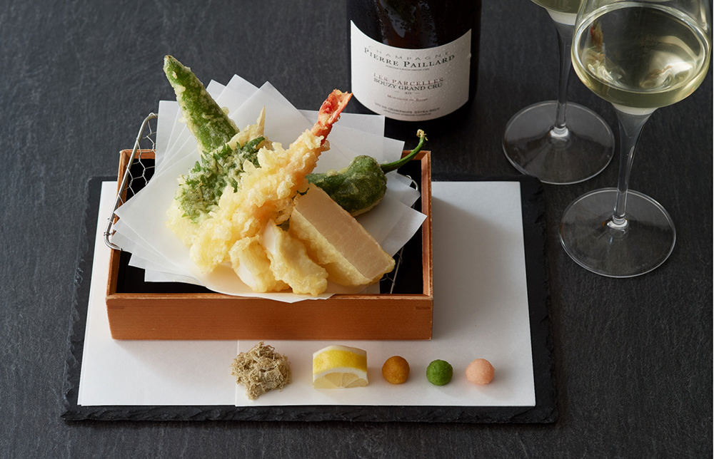 老舗天ぷら店「喜久や」が手がける、スタンディングスタイルのバル。“和モダン”をテーマに、外国ゲストもくつろげるような洗練された空間で、旬の食材を活かした天ぷらを味わうことができる。カラッと揚げたサクサクの衣は、程よい甘さが口のなかで広がり、お酒やご飯がすすむこと間違いなし。気軽に天ぷらをつまみながら、ワインや日本酒とのペアリングをお楽しみあれ。