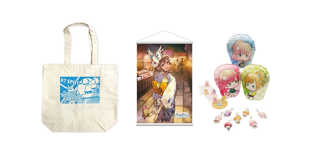(左)トートバッグ アトリエシリーズ プニ、渋谷PARCOに襲来! ¥2,000(中央)アトリエシリーズ B2タペストリー2022 type.ライザのアトリエ3 ¥3,000
