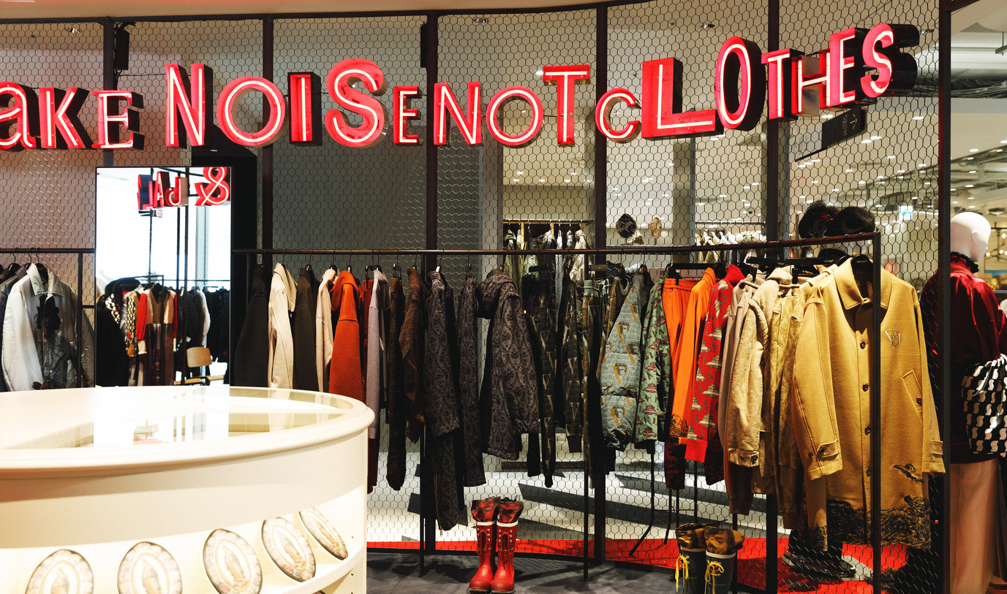「UNDERCOVER NOISE LAB」は、UNDERCOVER国内最大規模のインショップ。注目は、OPENを記念して制作された限定プロダクツ。大胆でエッジの効いたグラフィックにピクセル化したショップ名を添えたデザインから、クラシックカーに悪魔の翼が生えたようなイラストまで、UNDERCOVERらしい意匠をTシャツやスウェット、コーチジャケットなど多数のアイテムに落とし込んで展開する。