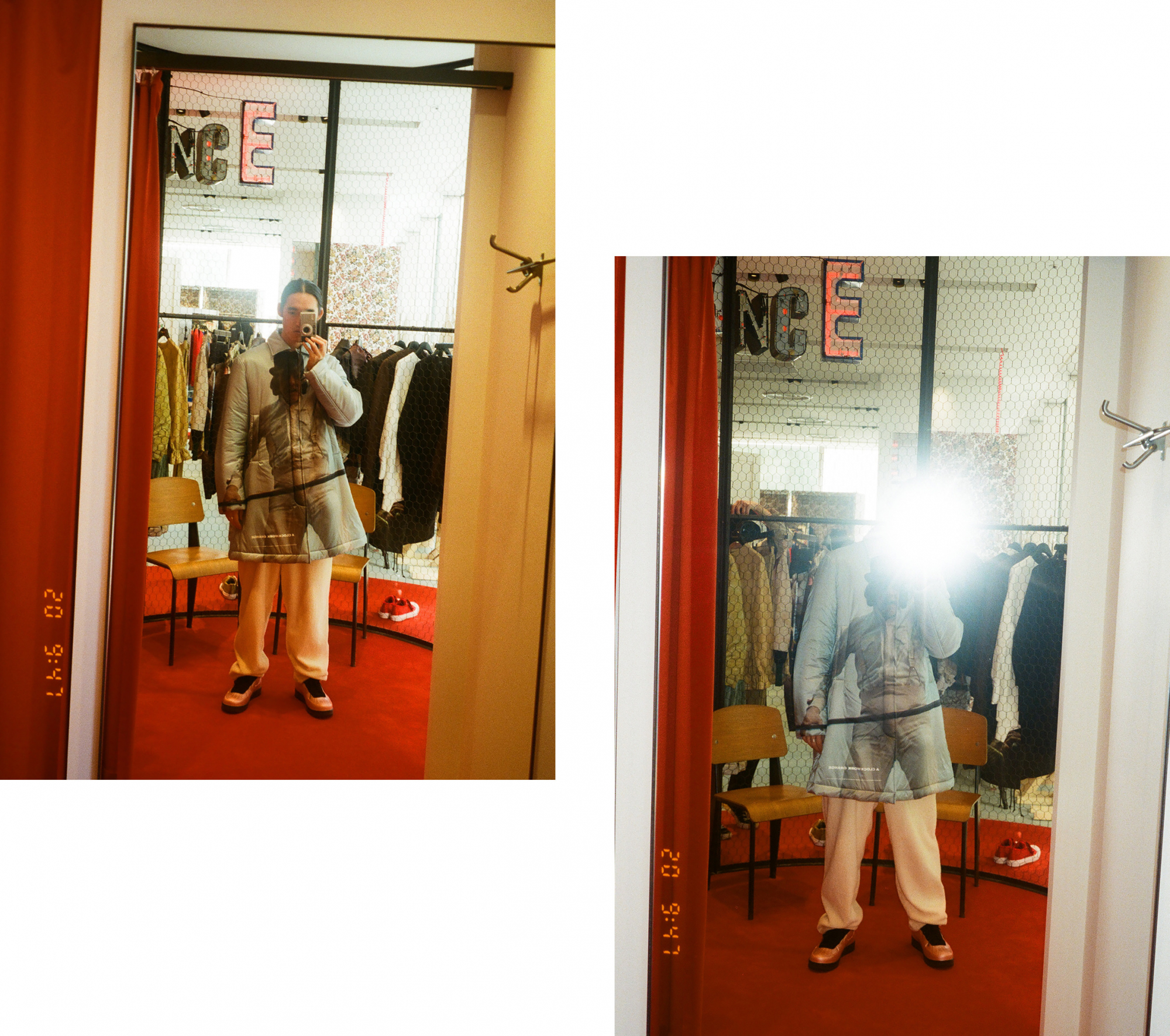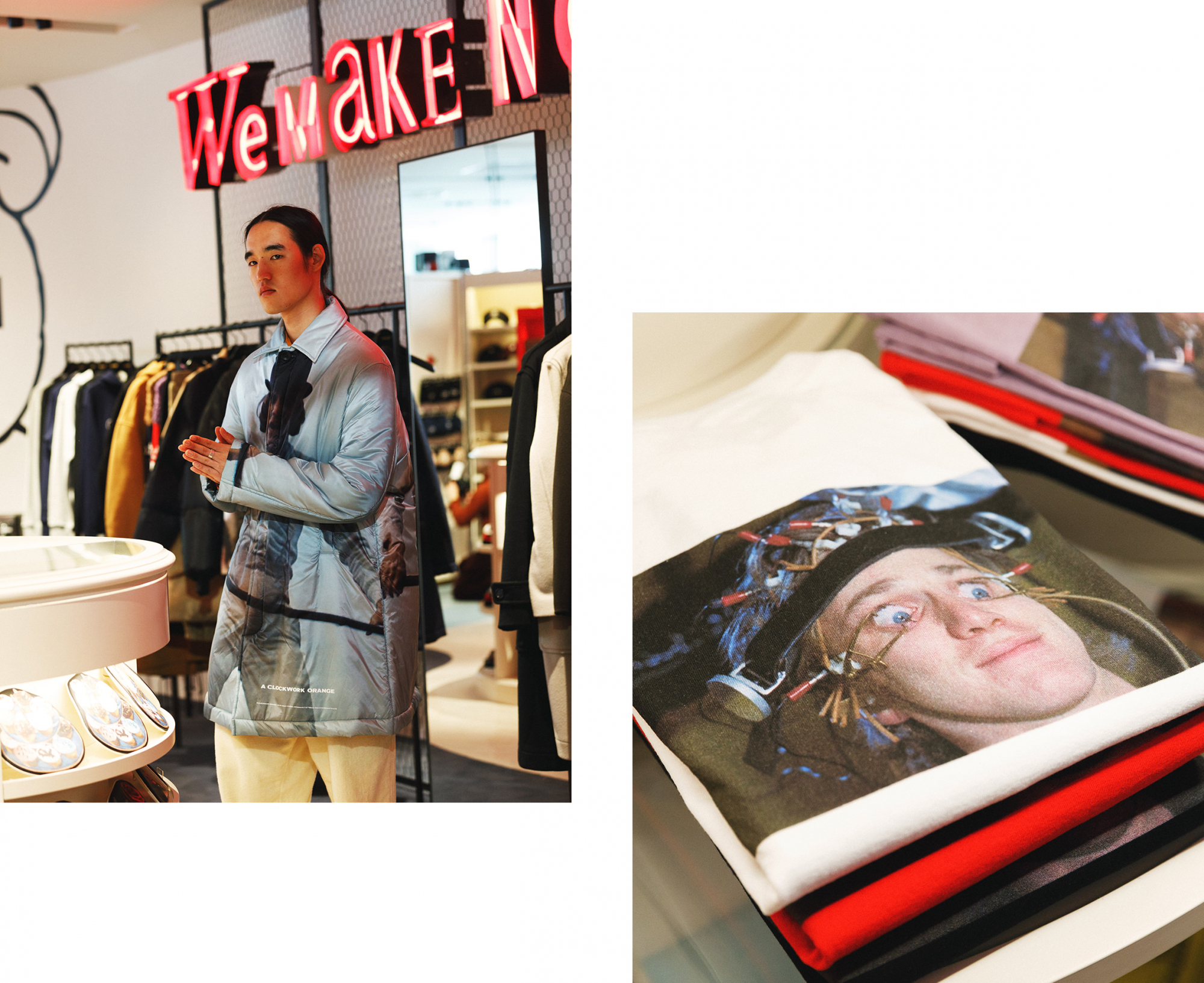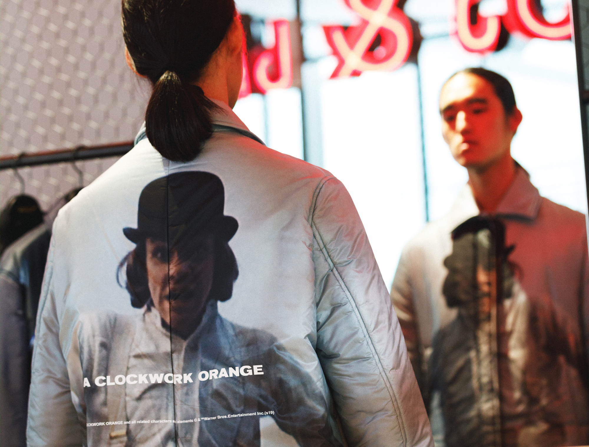 店内を見て回る服部さんが足を止め、まじまじと見つめていたアイテムは、1971年に公開されたスタンリー・キューブリック監督を代表する映画のひとつで、カルト的人気を誇る『時計じかけのオレンジ』とのコラボレートコレクション。お気に入りに袖を通して満足げな表情を浮かべる服部さん。「僕の大好きな映画のひとつです。映画の印象的なシーンをそのまま着られるなんて最高ですね。インパクト抜群なのでシンプルなアイテムと合わせて、デザインを目立たせたいです」。