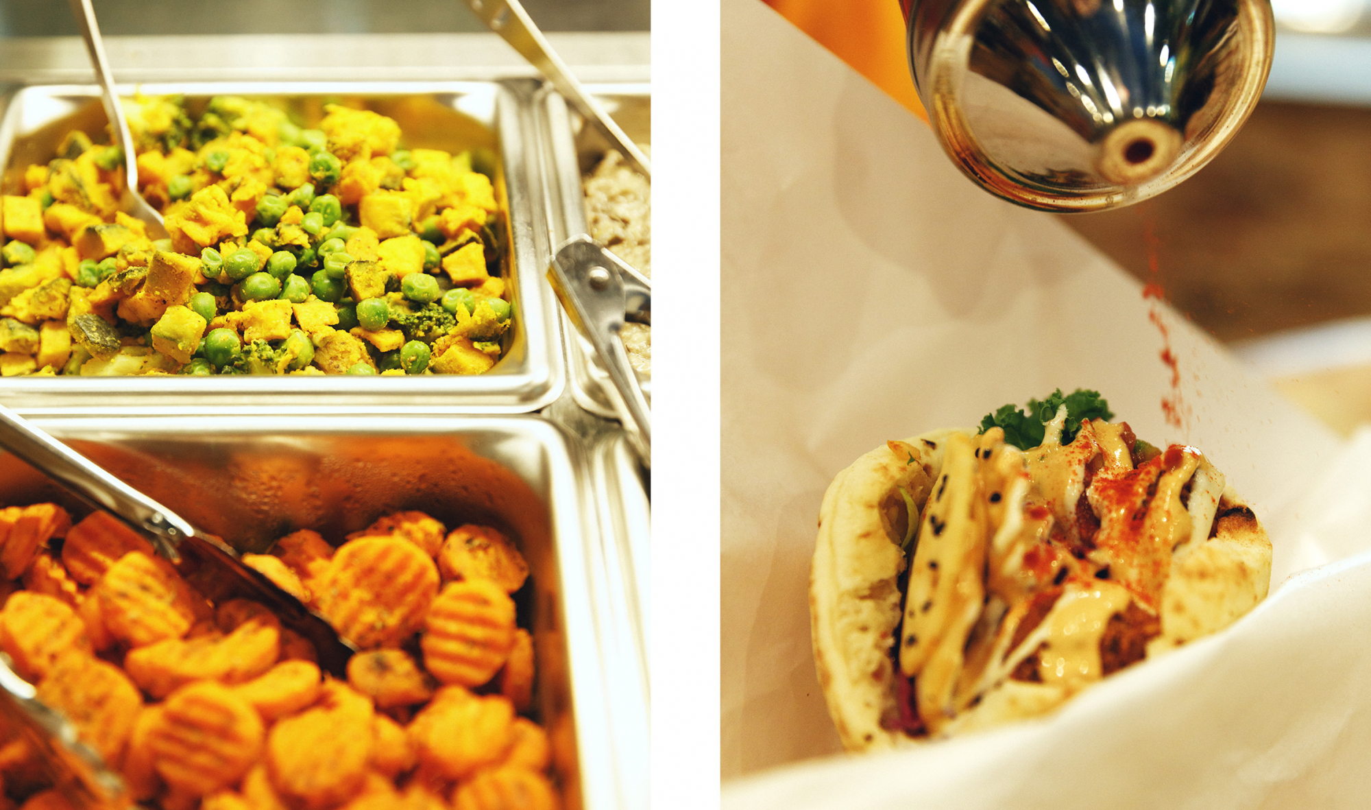 そもそも、あまり聞き馴染みのない“ファラフェル”。それは、すり潰したヒヨコ豆やそら豆にスパイスを加えて揚げたコロッケのようなもので、野菜と一緒にピタパンで挟んだものが「ファラフェルサンドイッチ」。ギルトフリー&グルテンフリーで、ヴィーガン料理として脚光を浴びている。ヴィーガン料理と聞くと、野菜を中心とするためヘルシーな印象で女性に人気と思われがちだが、「FALAFEL BROTHERS」の料理はボリュームたっぷりで、男性でも満足できる食べ応え。服部さんは、恵比寿店でこのメニューを食べた際に旅先のとある味を思い出したのだそう。「ファラフェルはパリ旅行の際に食べていたので、その時のことを思い出します。僕自身はヴィーガンではないんですけれど、このサンドはとてもおいしいし、満腹感もすごい。それでいてヘルシーっていうところがいいですね」。