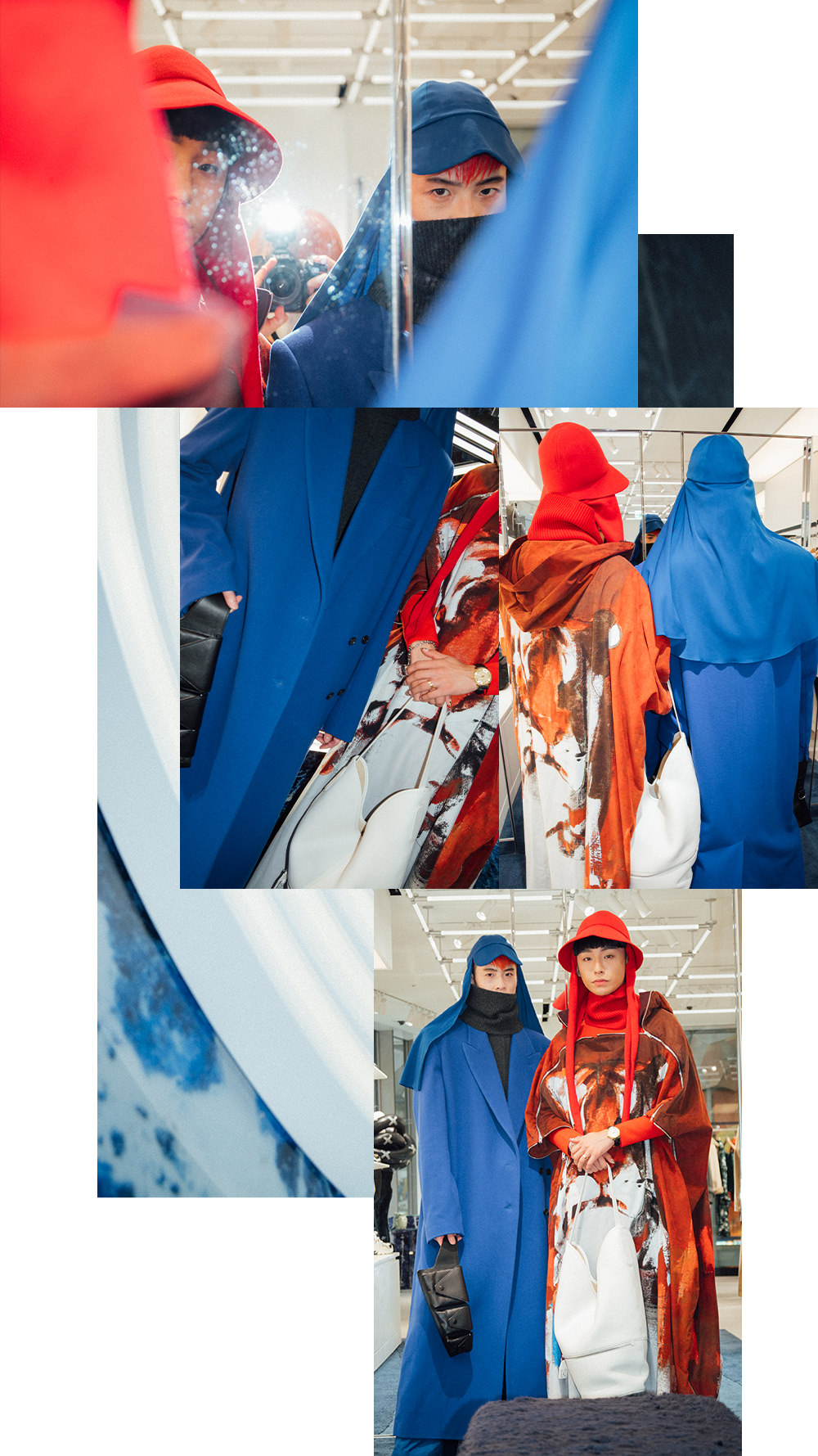 「普段なら青を選ぶところだけど、絶対にこの赤のルックは譲れないと思ったんです」と、NOAHさんの目を輝かせたのが「KENZO(ケンゾー)」2020AWのコレクションルック。アーティスティックなトラのグラフィックもお似合いだ。「ブルーのコートはロングシルエットが本当に美しいんです」とTAIKIさん。「このルックを着て、ファッションウィークに行きたいです!」と、どこか異国情緒が漂うエレガントなランウェイルックにテンションが上がる2人。