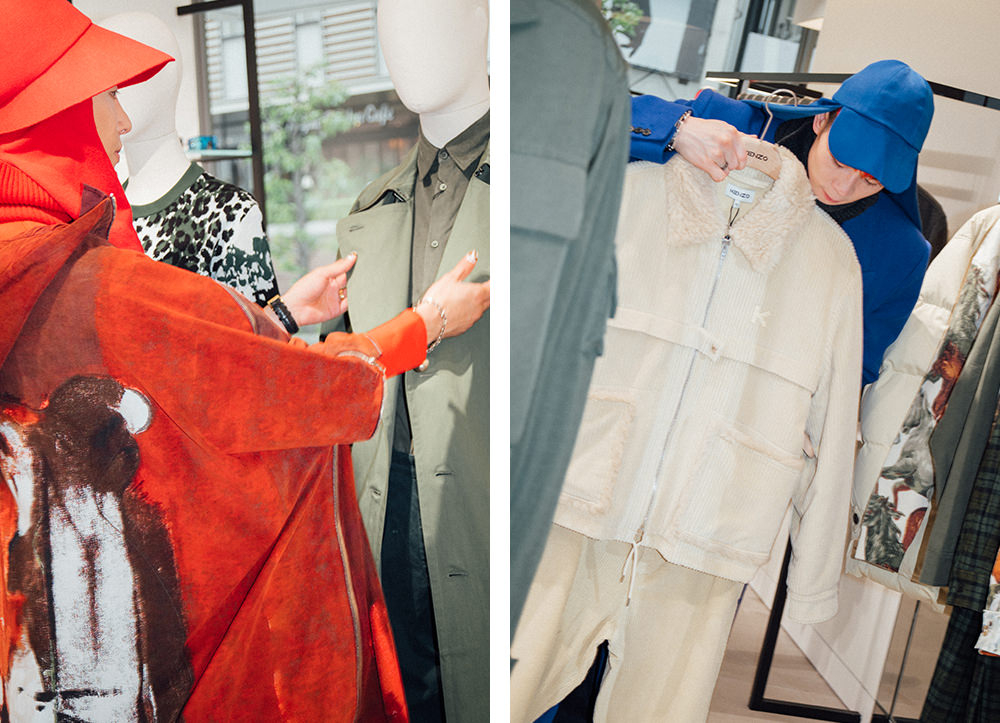 「KENZO SPORT」が新たなラインナップに加わったのも大きな話題だ。エレガンスと心地良さを追求した、テクニカル素材で作り上げられたグラィカルなコレクションは、ウェアから小物まで幅広い品揃え。2人が注目したのは、一新された“K”のロゴが施されたモノグラムのコインケースやカードホルダー。他にも、TAIKIさんはKENZOのコーデュロイのセットアップ、NOAHさんはカーキのコートと、店内に並ぶ新作アイテムに心を奪われた様子。カメラが回っている最中も、本気の買い物ムードに突入したようだ。