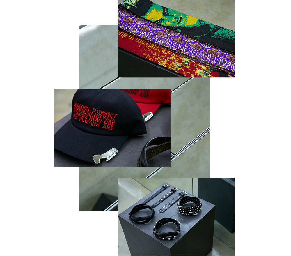 フロア中央には、あえて整然とさせることなく置かれたブロックたちの上に小物やアクセサリーが並ぶ。パールのスタッズベルトや、「MONTMARTRE NEW YORK(モンマルトル ニューヨーク)」とコラボレーションしたジャガードスカーフ、ボトルオープナーが付けられたメッセージ性のあるキャップなど、どれもインダストリアルミュージックやダーク・サブカルチャーなど、ブランドの根底にある要素を感じるアイテムたちが揃う。