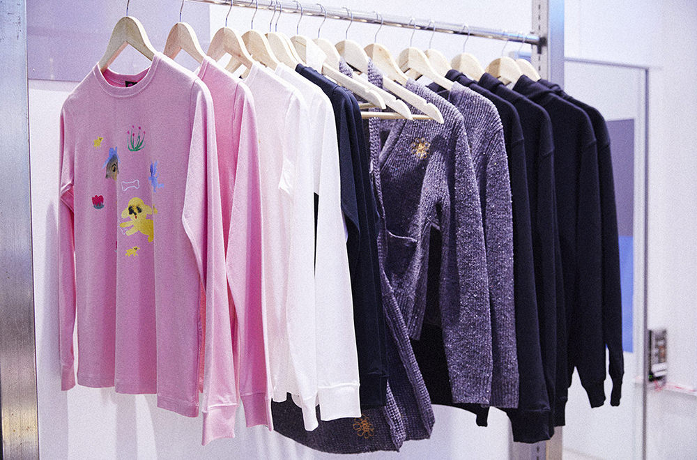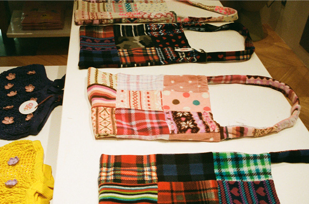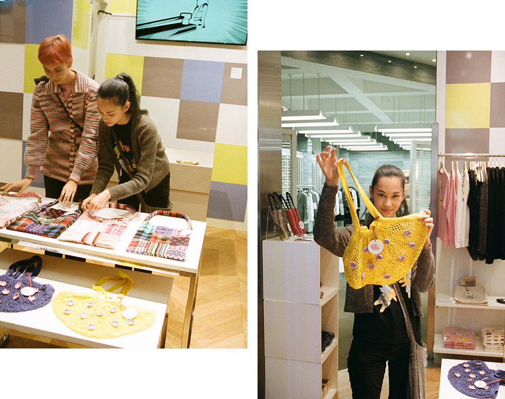 「コロナの自粛中に着なくなったTシャツをタイダイ染めにしたんです。それを裂いて織ってカーペットにしました。佑果ちゃんはその布でぬいぐるみを作ってましたね」(希子)。「ぬいぐるみに目をつけた瞬間、命が宿ったみたいな感覚があって、とても愛しい気持ちになりました。初日にぬいぐるみが完売してとっても嬉しかった!これからもどんどん可愛いモノ作っていきたいです」(佑果)。普段から友人との情報交換を欠かさず、自ら情報集めも怠らない。問題提起するドキュメンタリーもよく観ており、特に心に残っている作品は、映画『ザ・トゥルー・コスト ファストファッション 真の代償』だと言う。「『OK』のアイテムを地球にやさしいものへ少しずつシフトさせていくことが、手にとってくれる方へのメッセージになるといいな。新しいファッションの形を模索することは楽しいし、かっこいいだけのものを作るよりも、環境に負荷が少ないものを作る方がチャレンジングだと思います」。