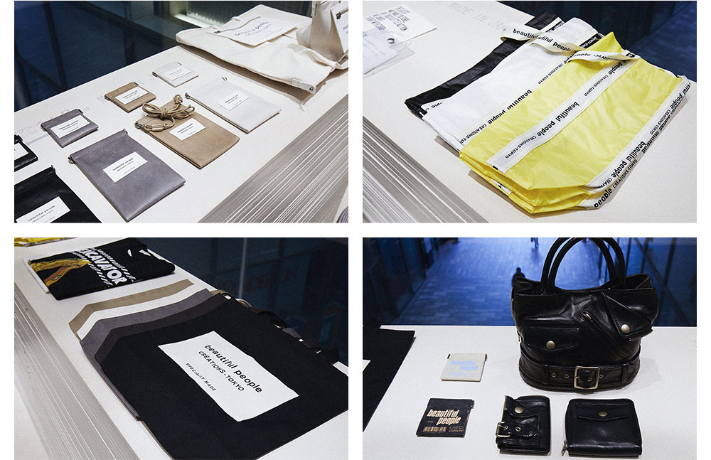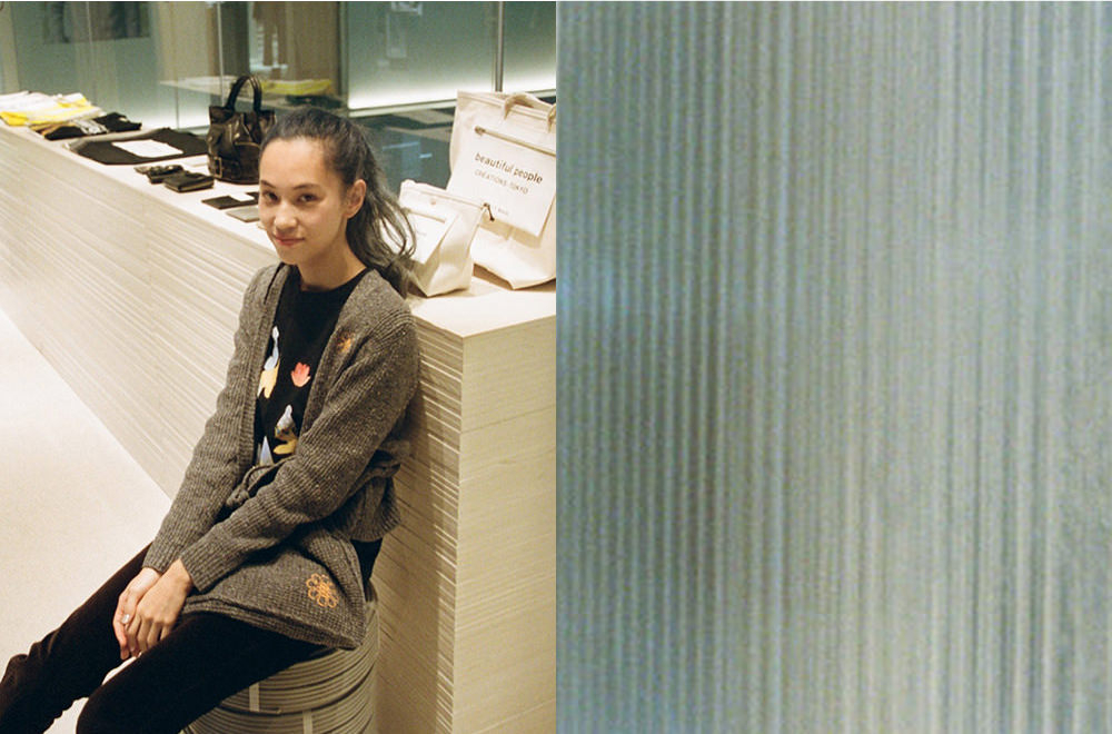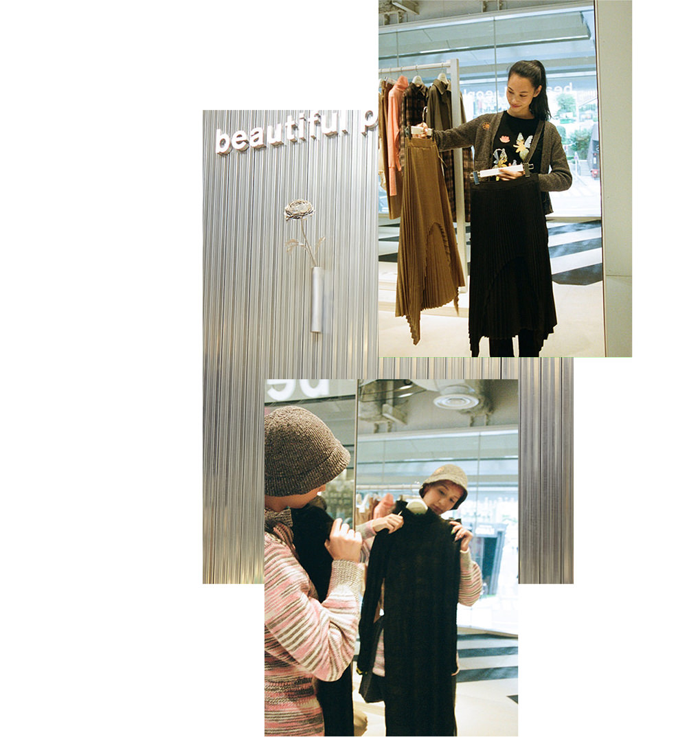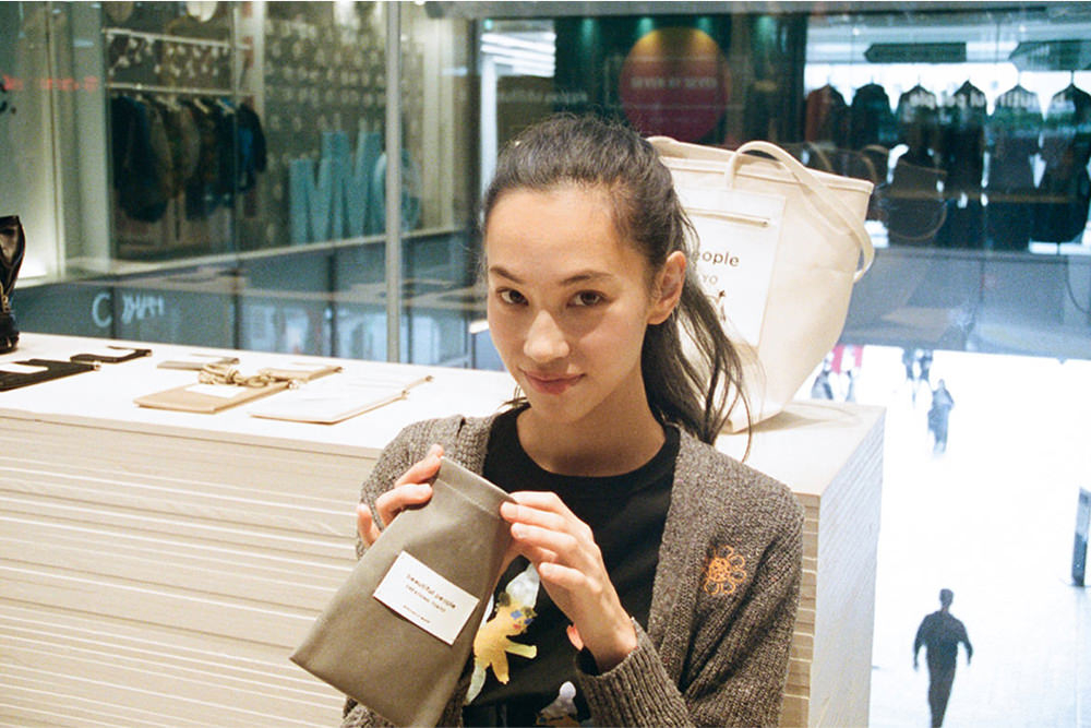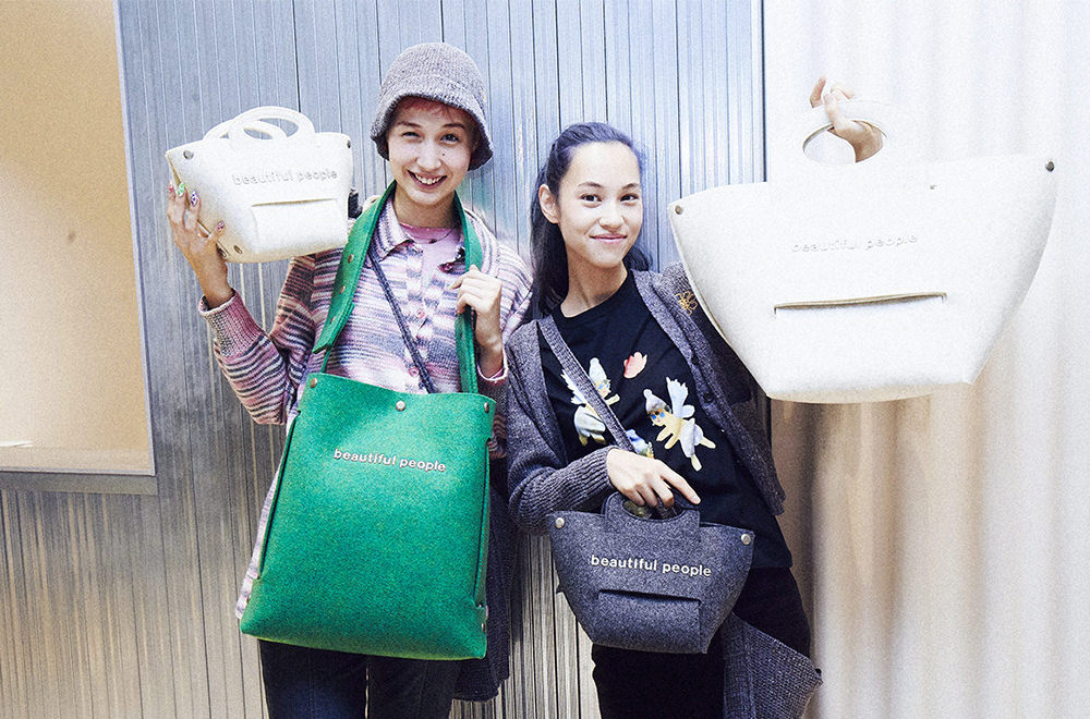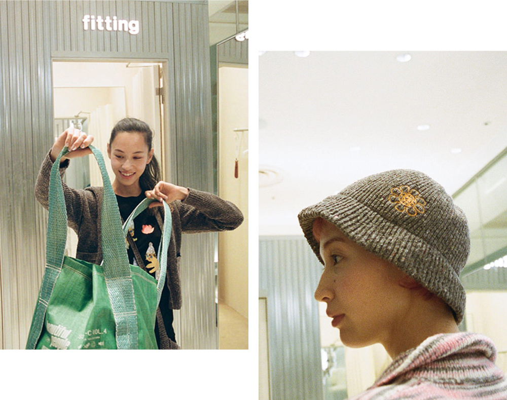 まずは、2Fの「beautiful people」へ。こちらの店舗はメンズ・ウィメンズの両方を展開するコンバインショップ。内装には、廃材や工業製品を使用し、接着剤や釘などを使わずに組み立てることで、解体してリユースできる什器が散りばめられているのも見どころ。「一目では気づきにくいけど、よく見るとサスティナブルな工夫が詰まった内装作りに惹かれます」(希子)。建築廃棄物や廃プラスチックなどの回収や運搬・保管に使用される、フレコンバッグにヒントを得たデザインも。アイディアとメッセージが詰まったバッグに、テンションが上がる水原姉妹。