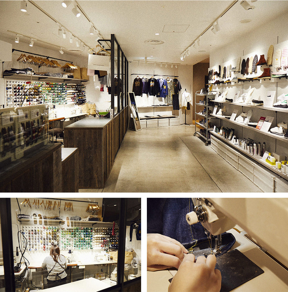 「Re⇆STOCK(リストック)」で修理を受け付けているのは、靴や洋服、時計、iPhoneなど。「自由な発想のカスタムやリメイクも引き受けていて“自分らしさ”を大切にするメンテナンスショップだなんて素敵」(希子)。店内にはミシン、靴修理専用機などを備え、簡単な丈詰めなら当日の仕上げが可能。最大の魅力は何といっても館内で購入したものをすぐに持ち込めること。実店舗はここ渋谷PARCOのみだそう。