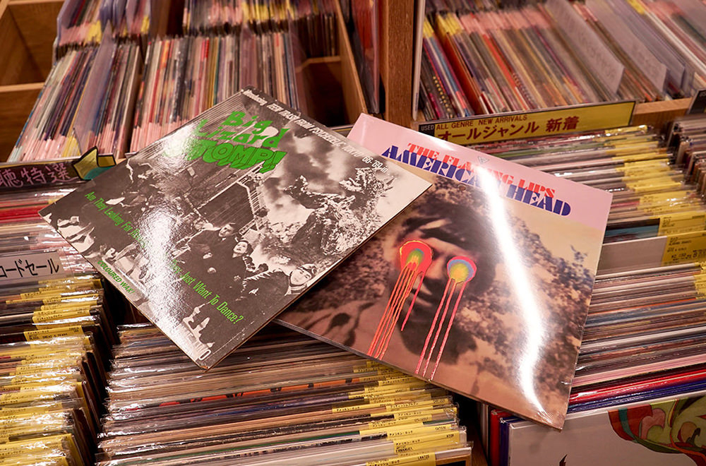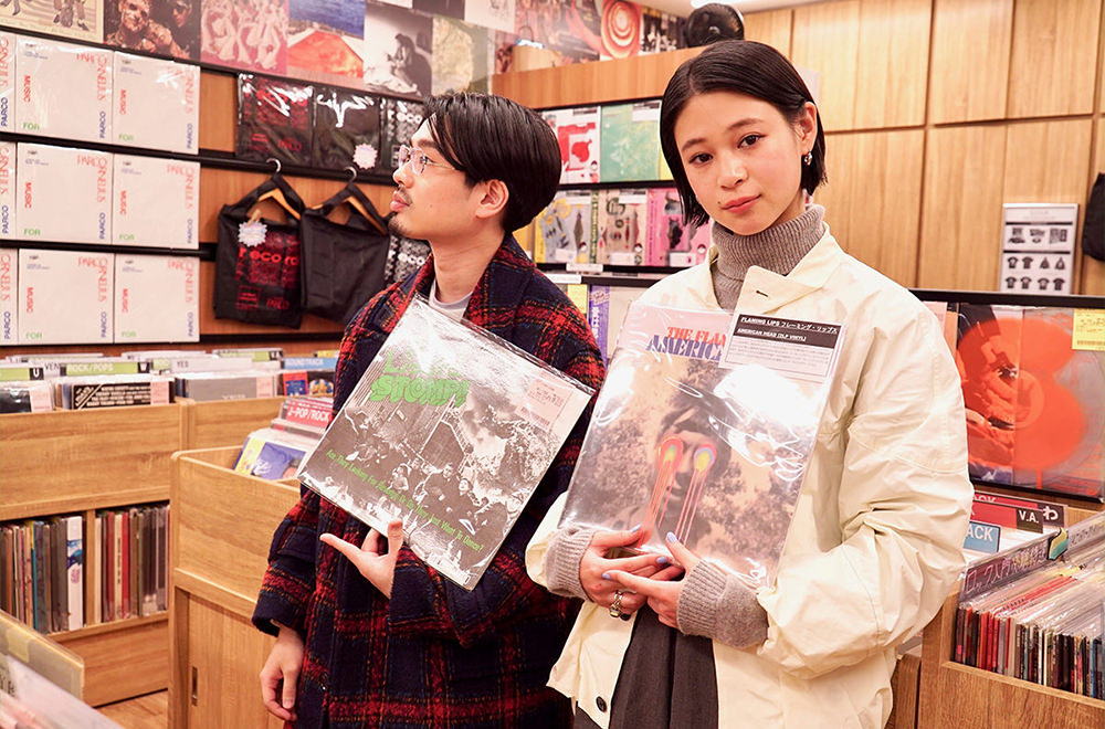 2人がお互いに聴いて欲しいと思うレコードを選んでもらうことに。ハマさんは「僕が選んだのは 「Big Lizard STOMP!」という60年代の日本のバンドのコンピレーションです。90年代に“日本にこんなカッコいいバンドがいたんだ”という海外からの目線で編集されたもの。miuちゃんが60〜70年代のイギリスのロックも聴くというのを聞いていたし、僕も20歳ぐらいの時によく聴いていたもので、たまたま見つけたのでレコメンドしました」。試聴機で実際に聴いてみたmiuさんは「すごいカッコイイ!」とノリノリ。そんなmiuさんが選んだのは「The Flaming Lips」の『AMERICAN HEAD』という新譜。「コロナの自粛期間中に予約注文して、私自身も家で聴いていたんですけど。すごく良かったので聴いてほしいなと思い、選びました」。