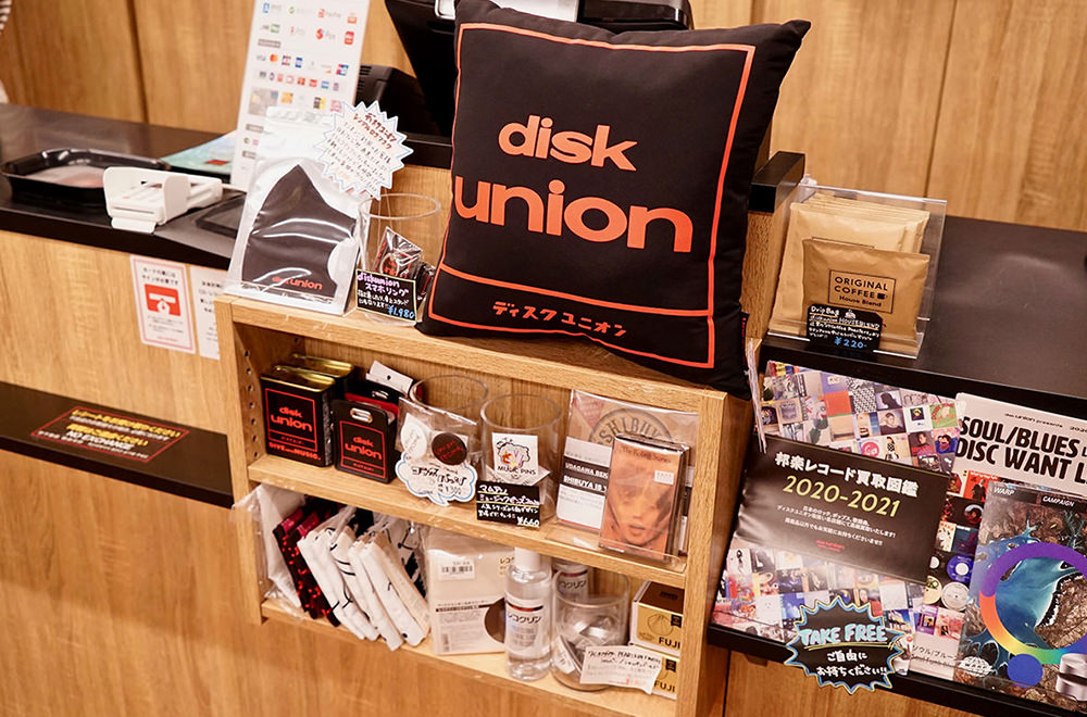 ディスクユニオン スクウェアロゴクッション¥4,620、ディスクユニオン シンプルロゴマスク¥1,100、ディスクユニオン スマホリング¥1,980 ※すべてtax in