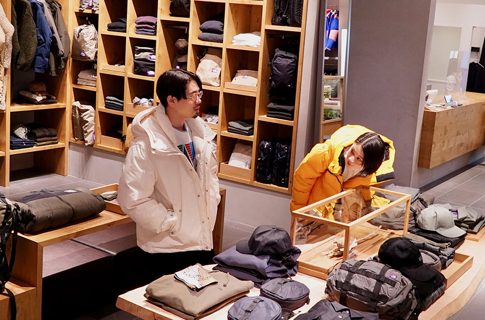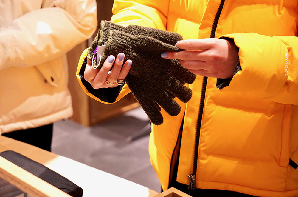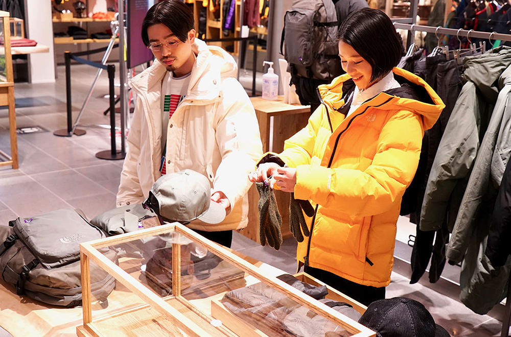 何を選べば良いか迷ってしまうのがクリスマスギフト。でも、相手のことを想ってショッピングする時間は、普段とはまた違った特別な体験となる。カジュアルなプレゼントであれば、THE NORTH FACEの小物はかなり優秀。こちらの店舗では、コーディネートのアクセントになってくれるビーニーがカラーバリエーション豊富に揃っているのでおすすめ。miuさんは「普段自転車に乗るから手袋が欲しい!」と、互いに今欲しい物などを聞き合いながらショッピングを楽しんでいた。