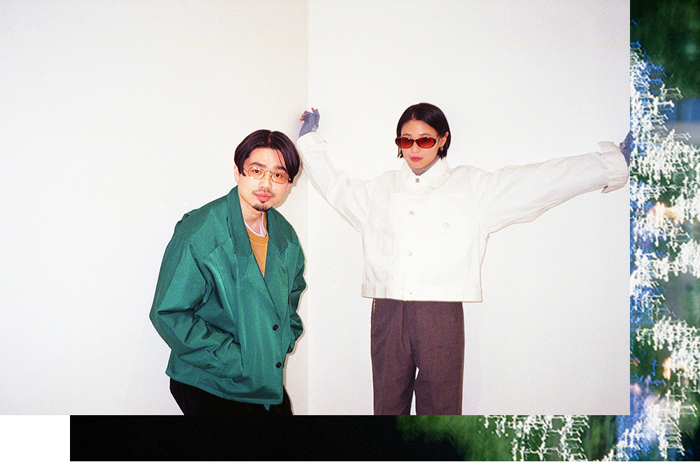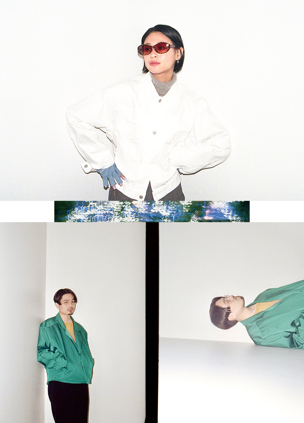 (左)<HOMELESS TAILOR>PLEATS JACKET ¥85,800、<SON OF THE CHEESE>Birds Knit ¥25,300(右)<product almostblack>Short Denim Jacket / 20AW-PBL02 ¥39,600、<HELLRAZOR>T-800 SUNGLASS ¥6,600、<O->レイチョウルイラボ FINGERLESS GLOVE ¥9,900