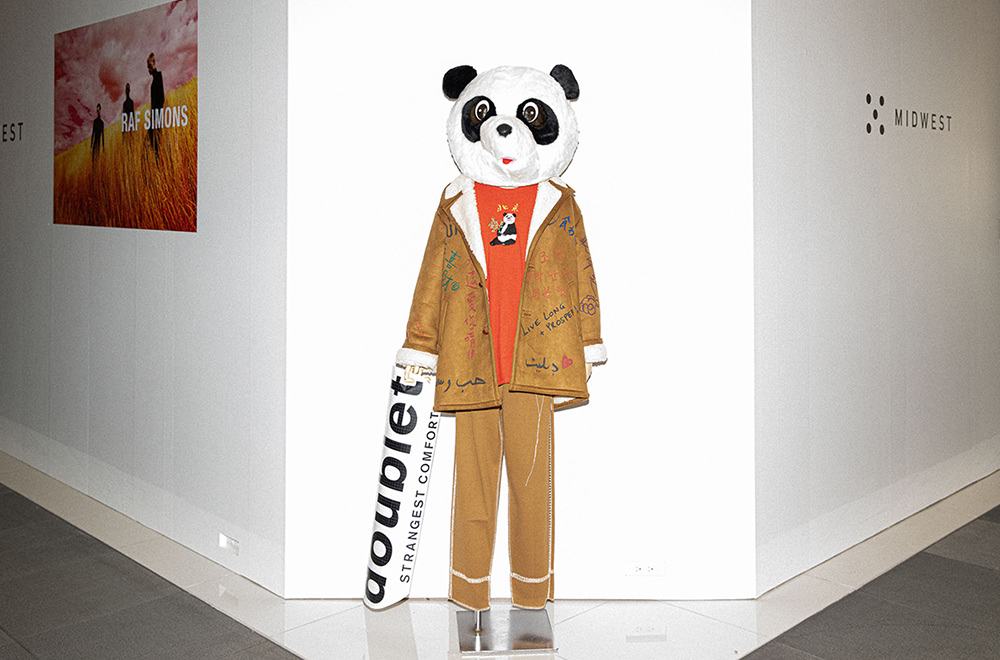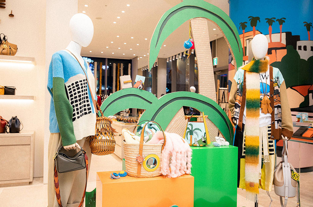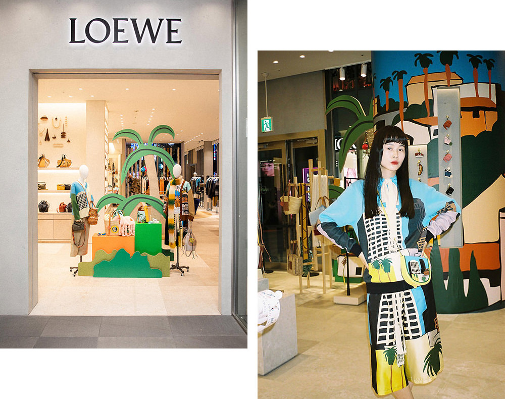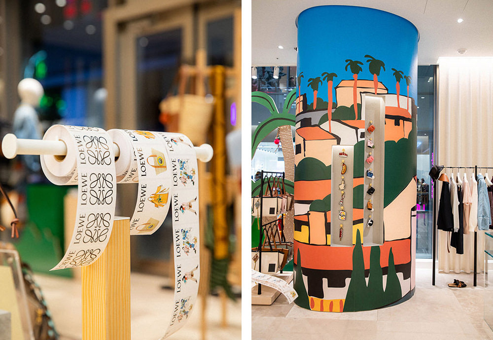 左_モデル・田中シェン氏が手がけたイラストをプリントしたステッカーを限定配布。右_KEN PRICE氏による、イースター島のヤシの木などのドローイングで彩られた店内。