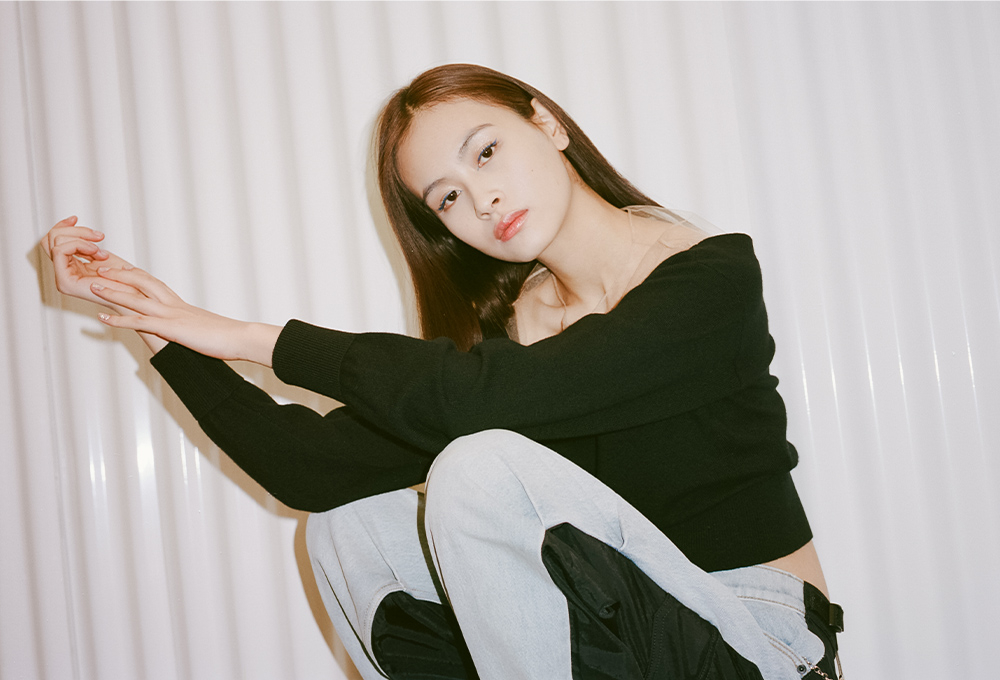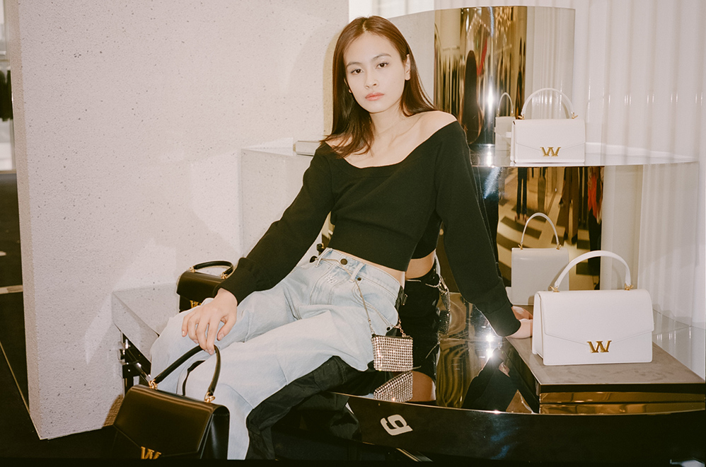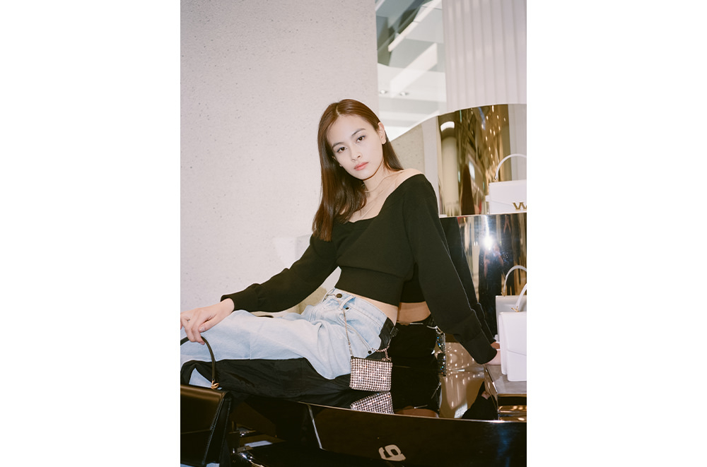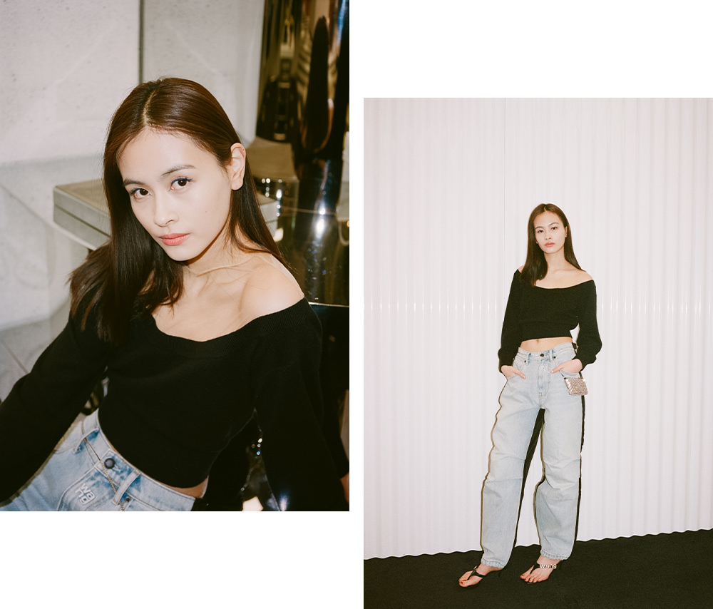 シンプルなレザーバッグやラインストーンで埋め尽くされたポーチなど、店頭でひときわ輝いていた今季の小物たち。光沢感のあるしなやかなレザーを直線的なシルエットで仕上げたバッグは、持つだけでストリートなスタイルを上品にクラスアップする。「シックなブラックレザーにゴールドのロゴとチェーンが映えて、アクセサリーなしでもドレスアップできますね」とララさん。ミニマルなスタイルだからこそ、彼女のシルエットと眼差しの美しさが際立っている。