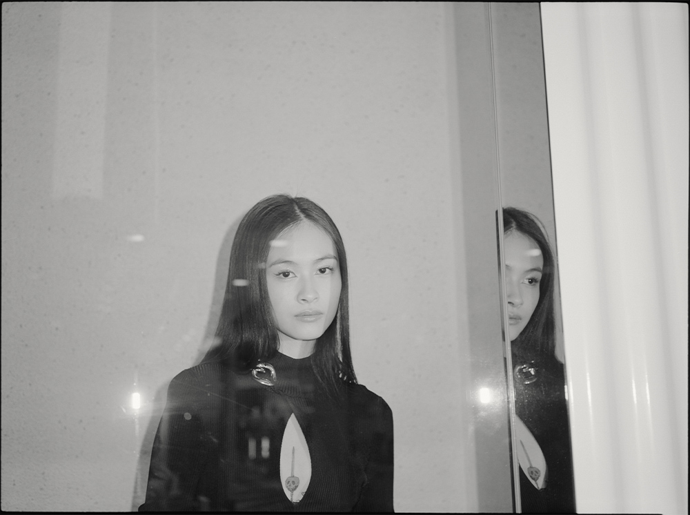 ブランドを象徴するモノトーンのアイテムの間に、ライトカラーのアイテムやサテンやラインストーンの小物が目を惹く。最新コレクションをチェックしたララさんは最後に、胸元がカットアウトされたドレスに身を包んだ。「普段はリラックスしたスタイルも好きだけど、時にはこうしてドレスアップして出かけたいですね」。