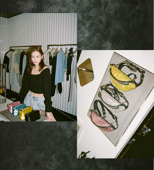 「かわいい!」と思わず手に取ったのは、ラインストーンのシリーズ。体にフィットするクロスボディのタイプやポーチ、2WAYタイプなど、スポーティーなデザインのものが揃う。「ラインストーンはゴージャスだけど、デザインがスポーティーだから使いやすい。今日のコーディネートだったらウエストポーチをつけたいな。体が動くたびにラインストーンが輝いて、身につけていてワクワクします」とララさんも気に入った様子だ。