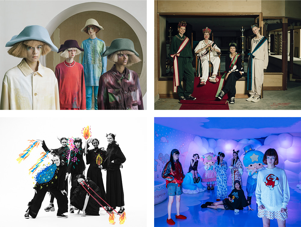 ウィメンズコレクションは“The SIXTH SENSE”と題し、UNDERCOVERの多面性を6つの異なるコンセプトに基づいてグループ分けし、デザインしたコレクションとなっている。それぞれ特殊な超能力を持つ黒い衣装をまとった6人をイメージしたシリーズは、異素材を組み合わせた黒一色のデザイン。脇や肩は羽根やバックル、リボンなどで継ぎ合わされている。少女たちが夢見る可愛さと狂気が同居したおとぎ話の世界をイメージしたシリーズでは、サンリオのキャラクターをプリントしたルームウェアシリーズなどが並ぶ。