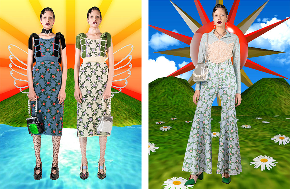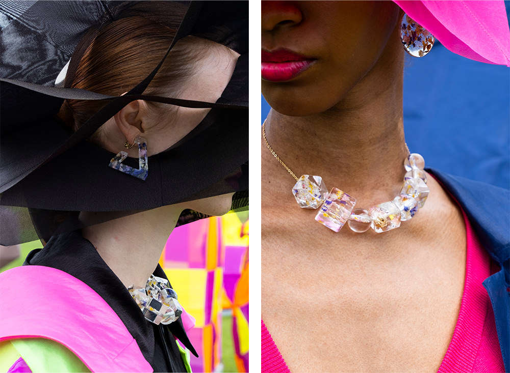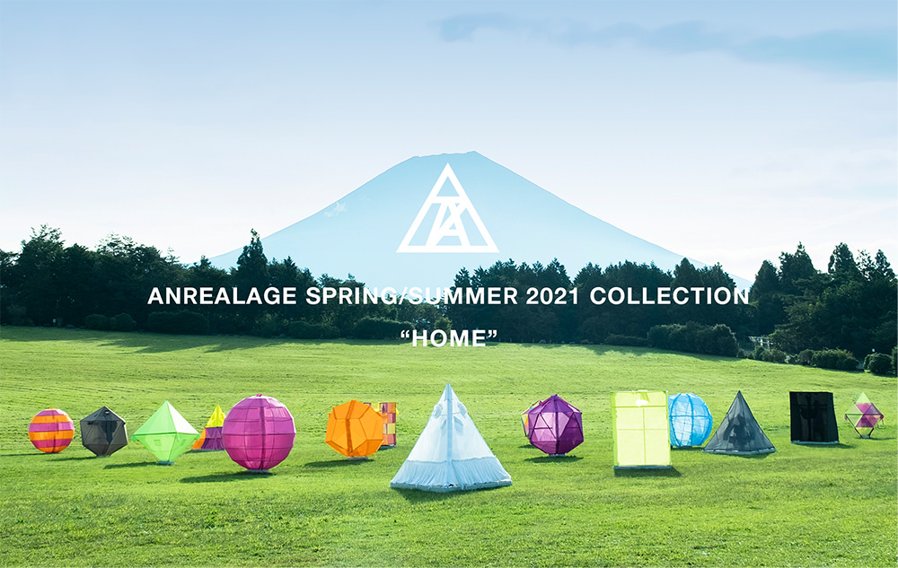 「家のような服。服のような家」をコンセプトにした「ANREALAGE」の 2021 S/S COLLECTION “HOME”。球体や4面体など6つの多面体をベースにして、洋服を移動可能な家として捉えて制作。骨格を入れると2メートルのパーソナルスペースになるが、骨格を外すと空間は服に変わる。さらに、それらのアイテムはどれも抗ウイルス繊維と抗ウイルス加工「フルテクト®」が施されている。今回のコレクションではアクセサリーブランド「ANEVER」が新ブランドとしてデビュー。ドライフラワーをアクセサリーの樹脂に閉じ込めるという、本物の花を使ったフラワーパターンが何とも華やかだ。