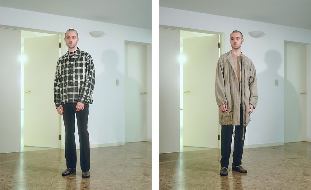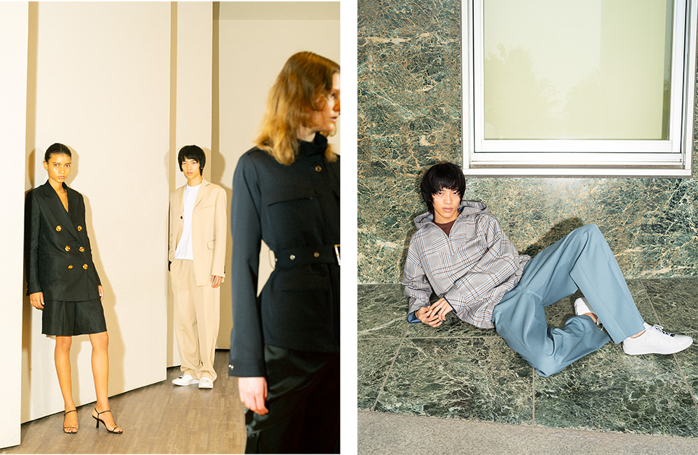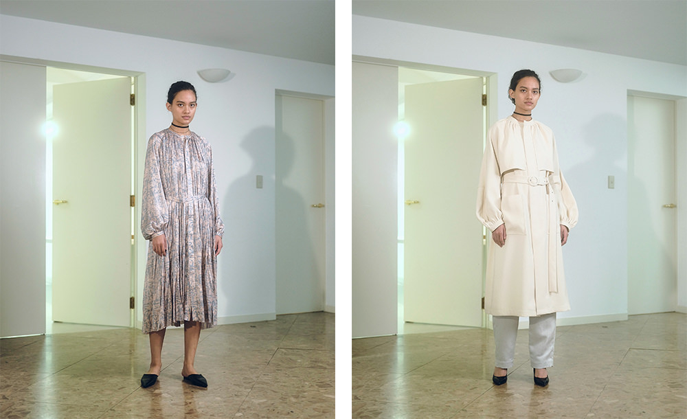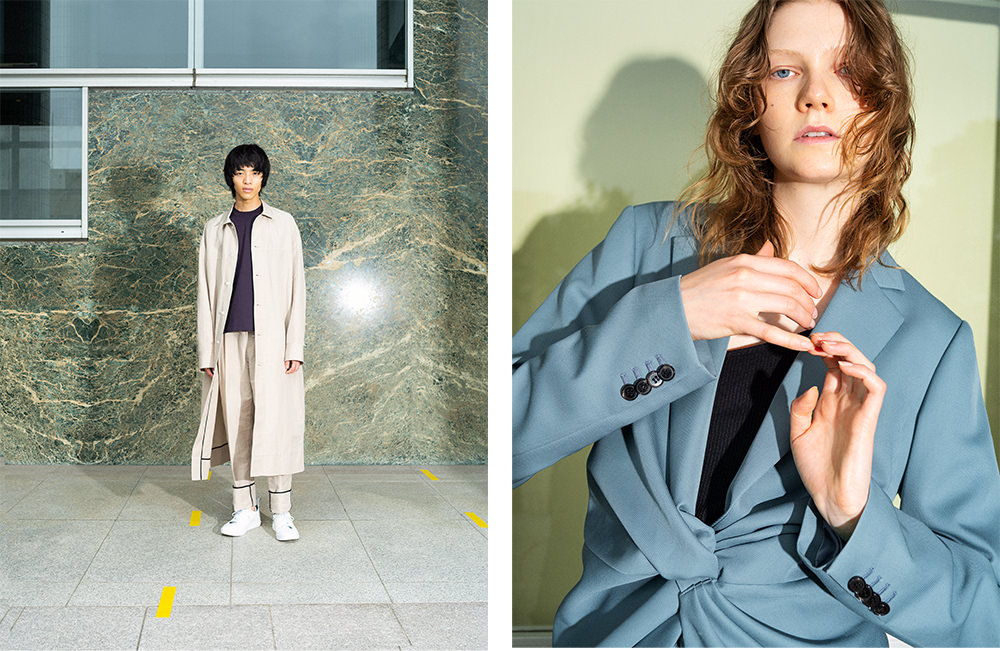 遊び心と高揚感を持った大人のリアルクローズを提案する「CINOH」は、今季“これからのちょっとした外出の際に着る特別な普段着”をイメージソースにデザイン。程よく肩の力を抜きつつも、ルームウェアのようなリラックス感は取り除き、あくまで外出をするためのクリーンでエレガントなカジュアルスタイルを意識。それを繊細な素材とタフな素材、立体裁断を強調したディテールとを混ぜ合わせ提案。細部までこだわった素材と仕様で、これまでにない上質な普段着という新たな価値観を創り出している。